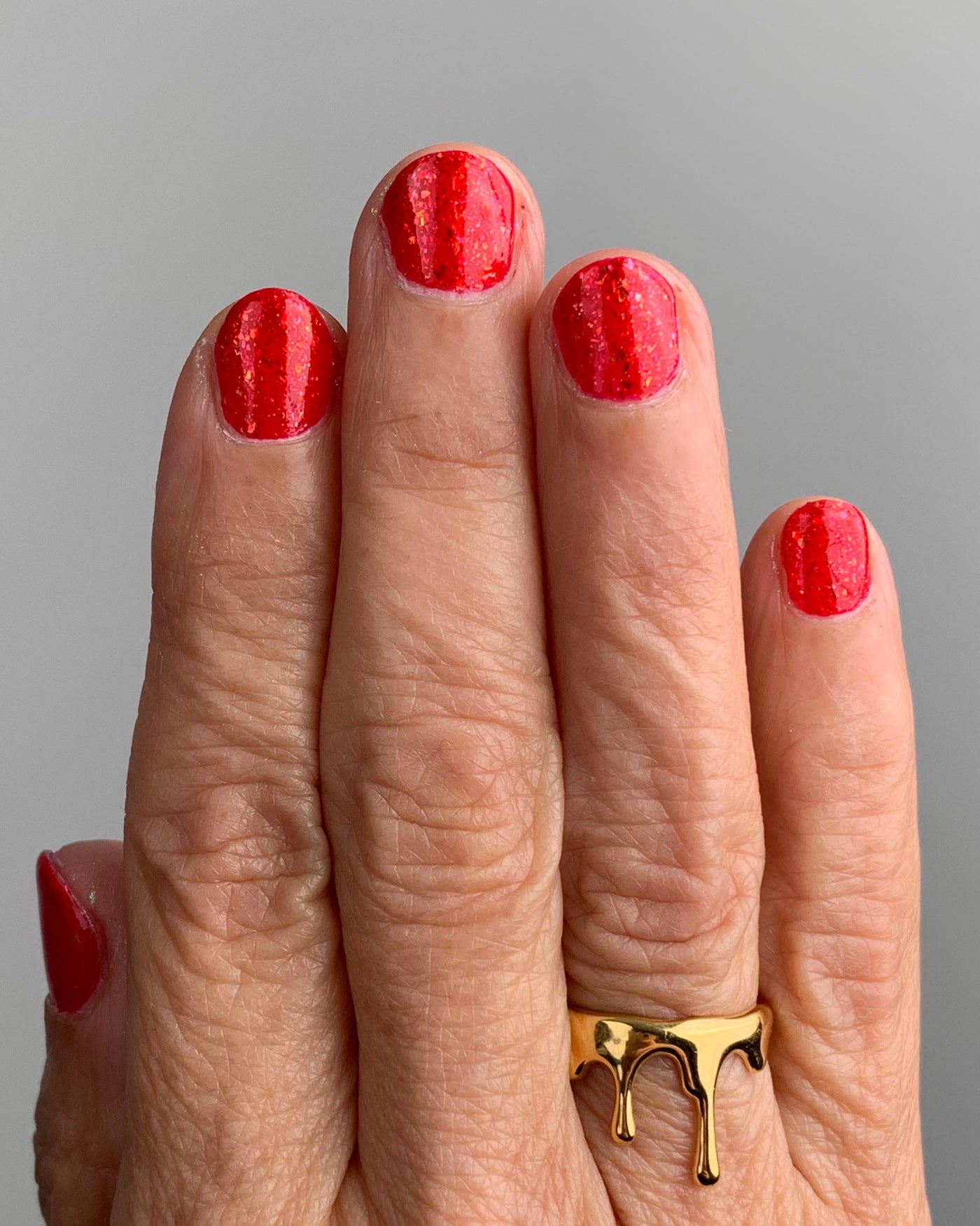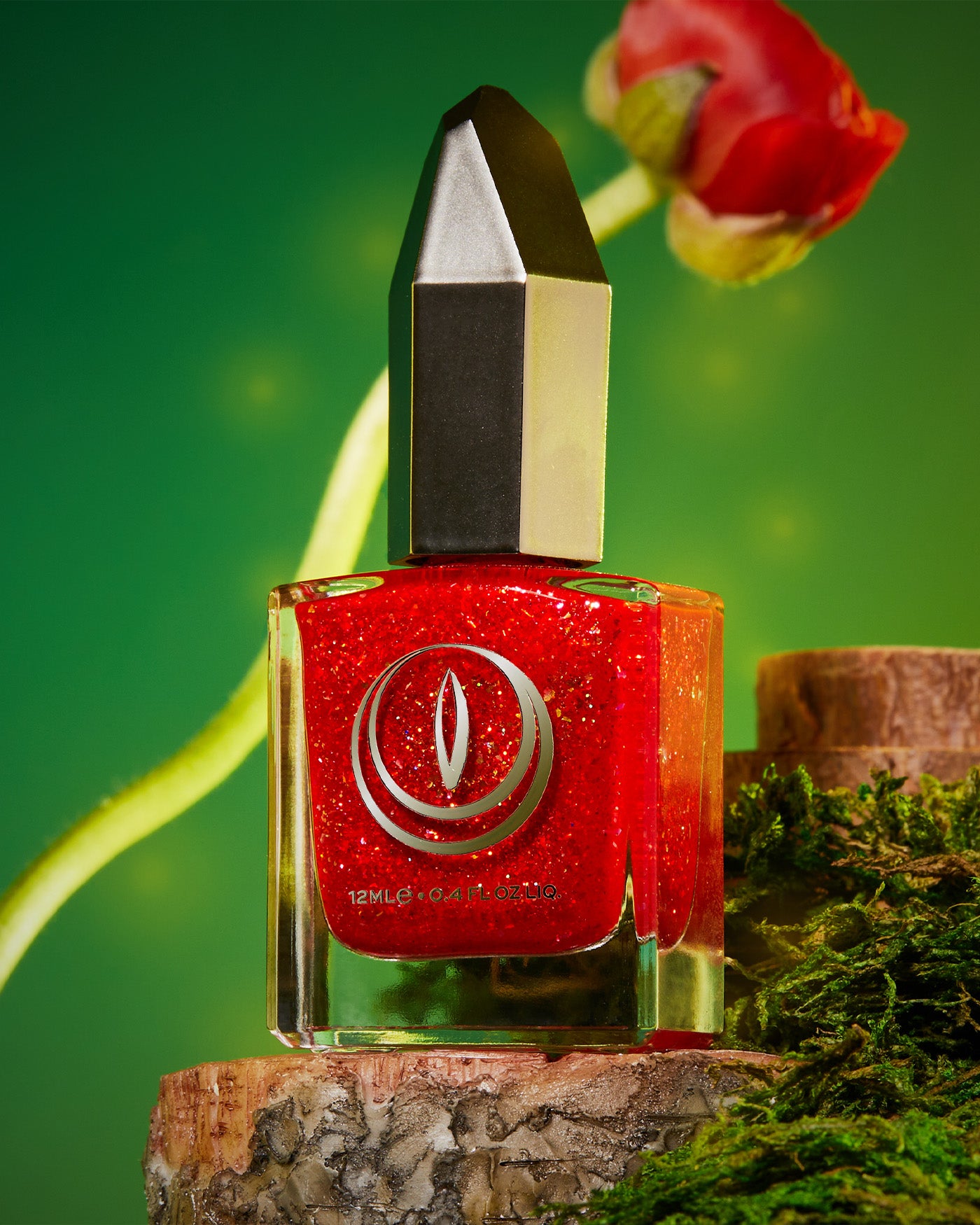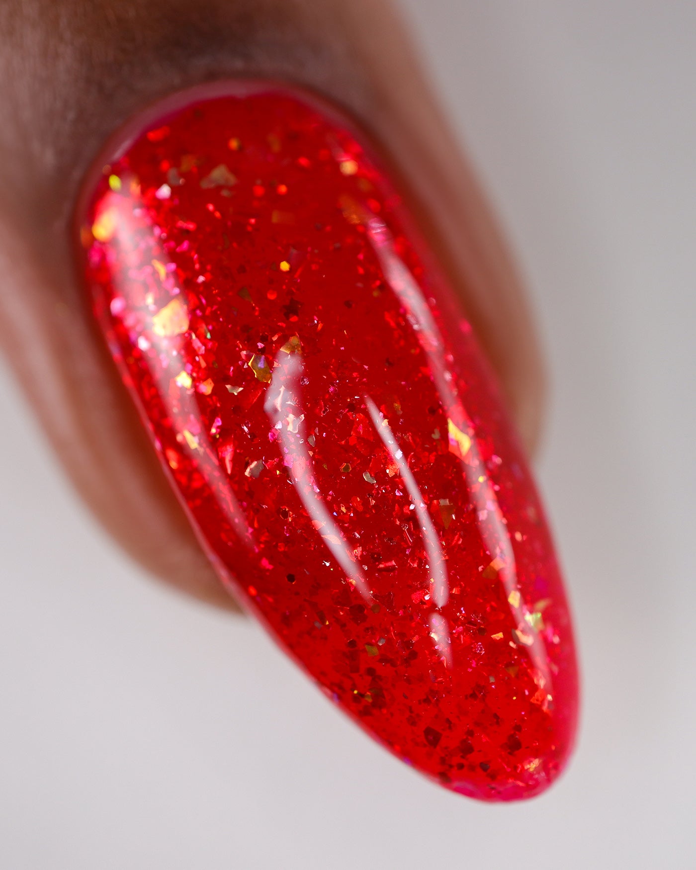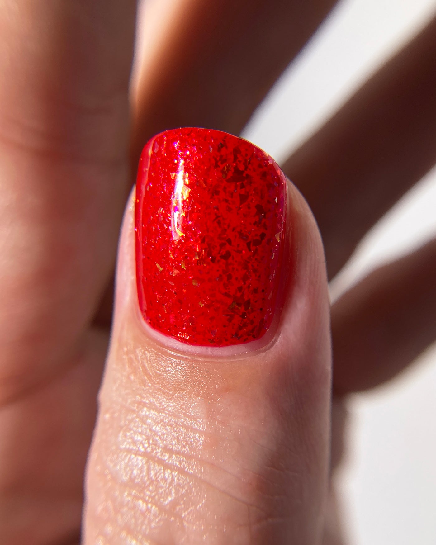 wanna take your claws on their own totally f a r o u t little journey? uncap this enchanted red jelly tincture and set your nails aglitter and aglow with bitty bits of holo glitter and magical multicolor flakies that twinkle like a teeny tiny kingdom of technicolor toadstools.