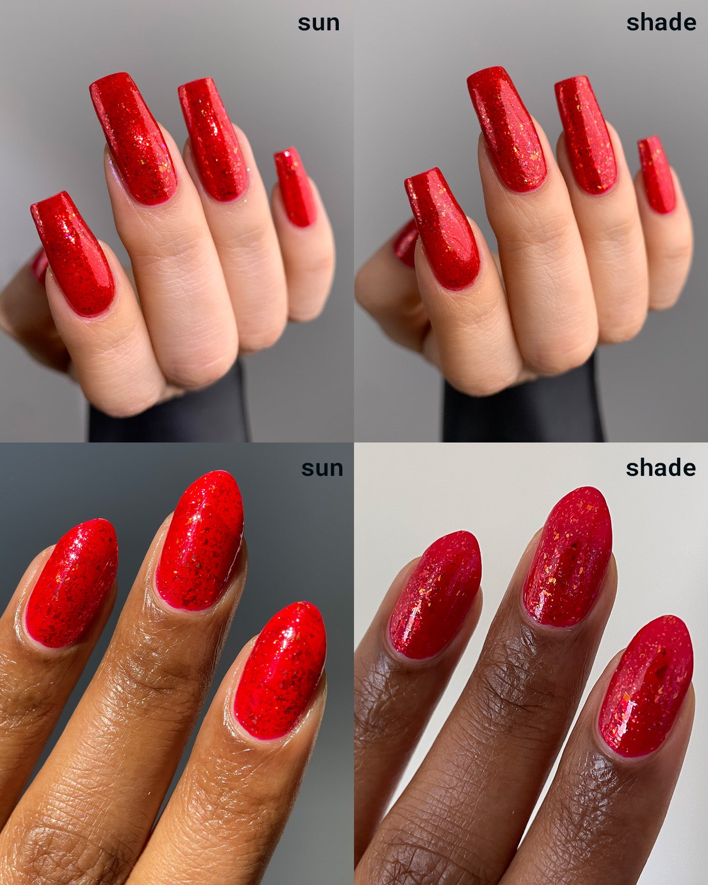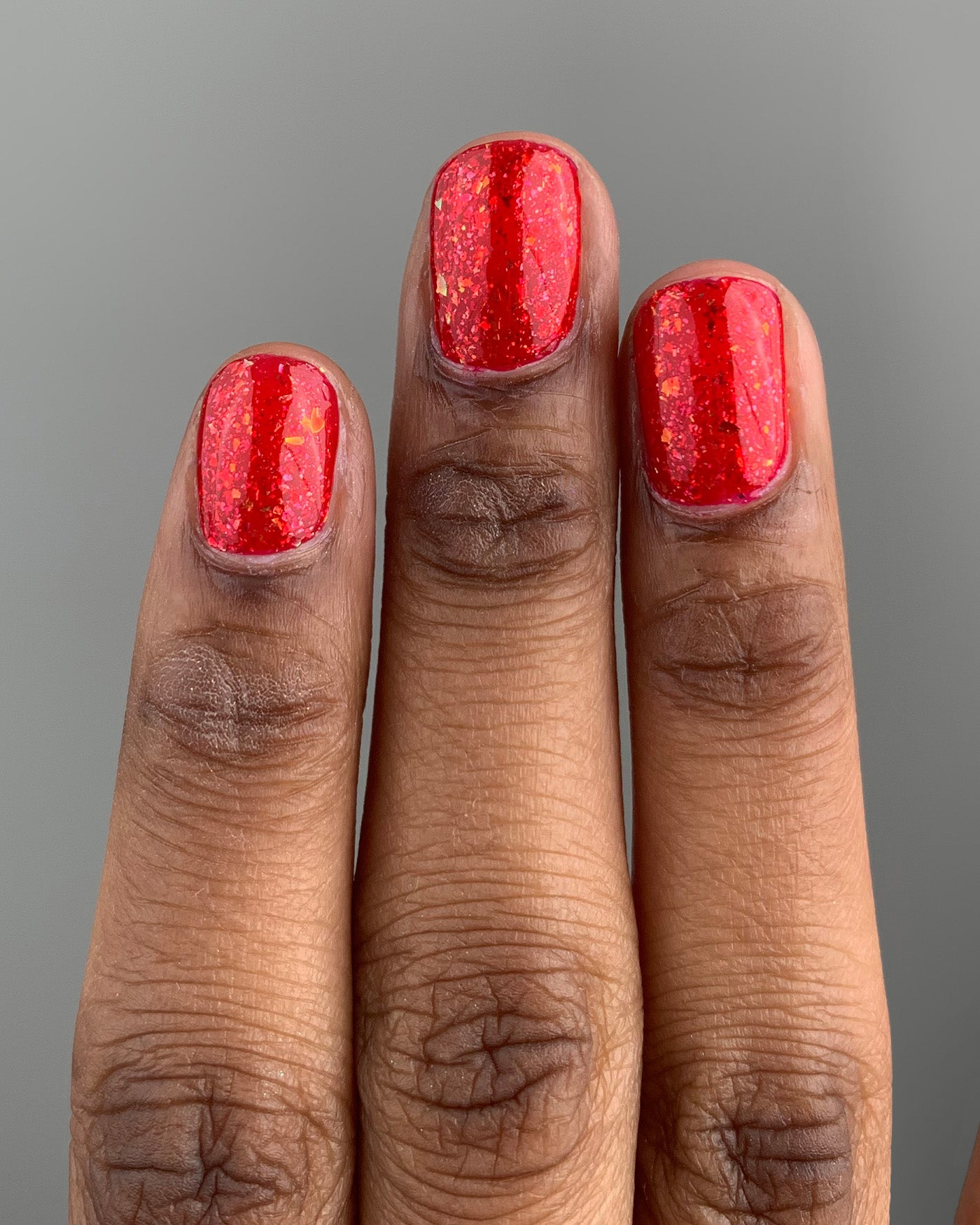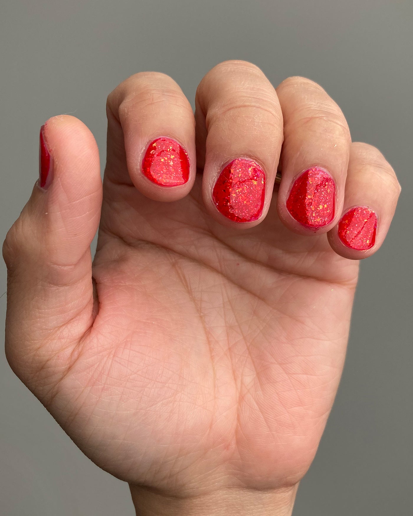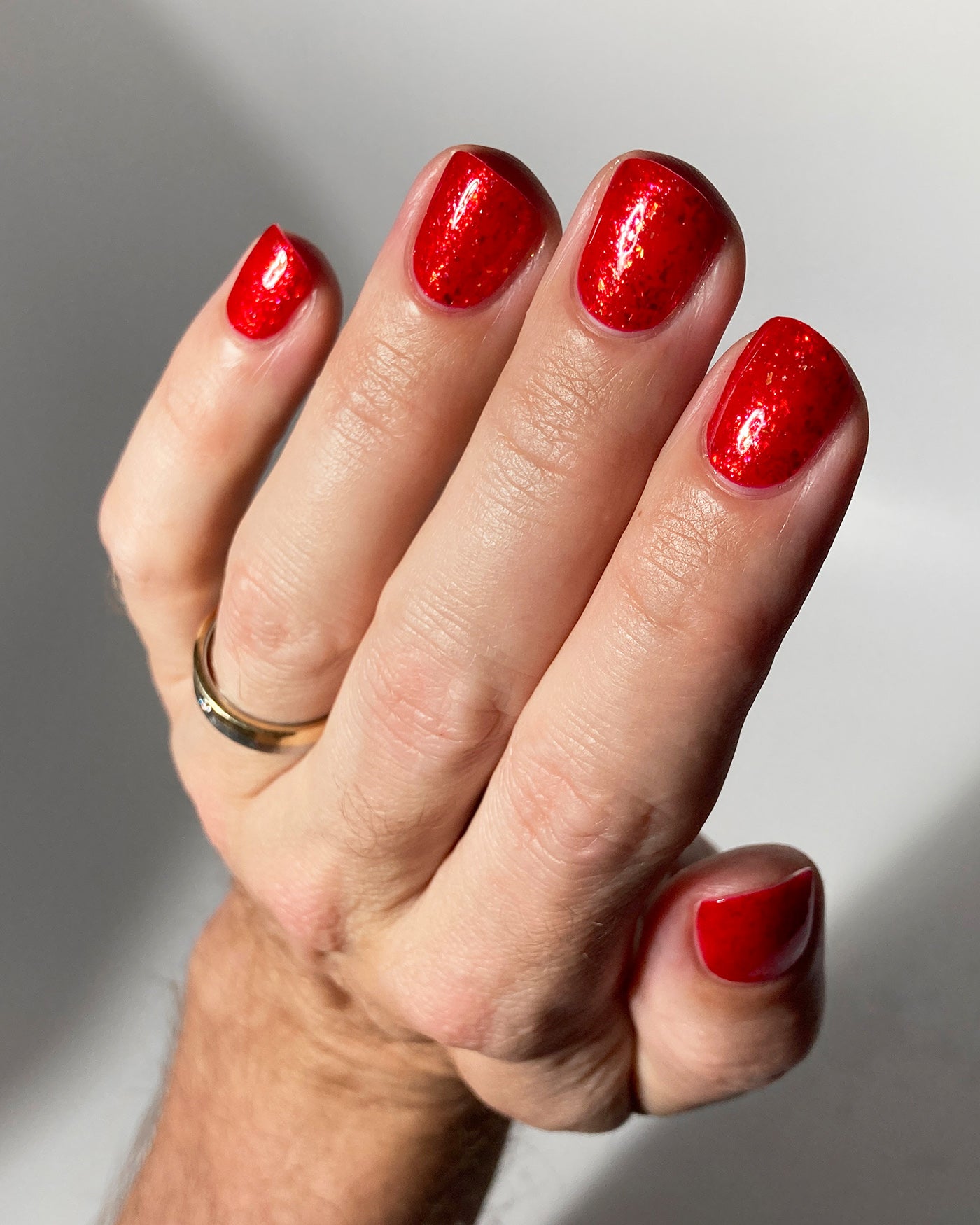 wanna take your claws on their own totally f a r o u t little journey? uncap this enchanted red jelly tincture and set your nails aglitter and aglow with bitty bits of holo glitter and magical multicolor flakies that twinkle like a teeny tiny kingdom of technicolor toadstools.