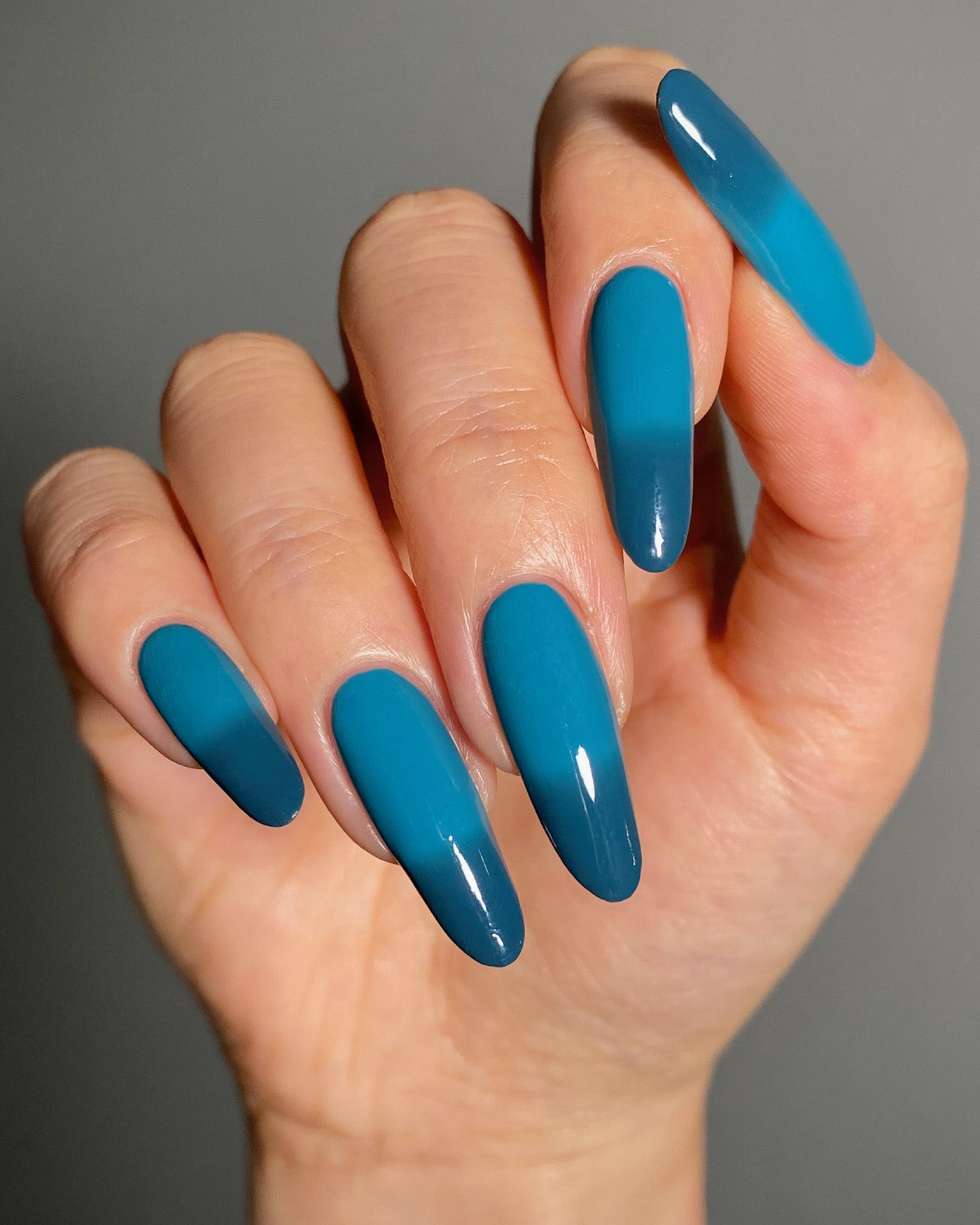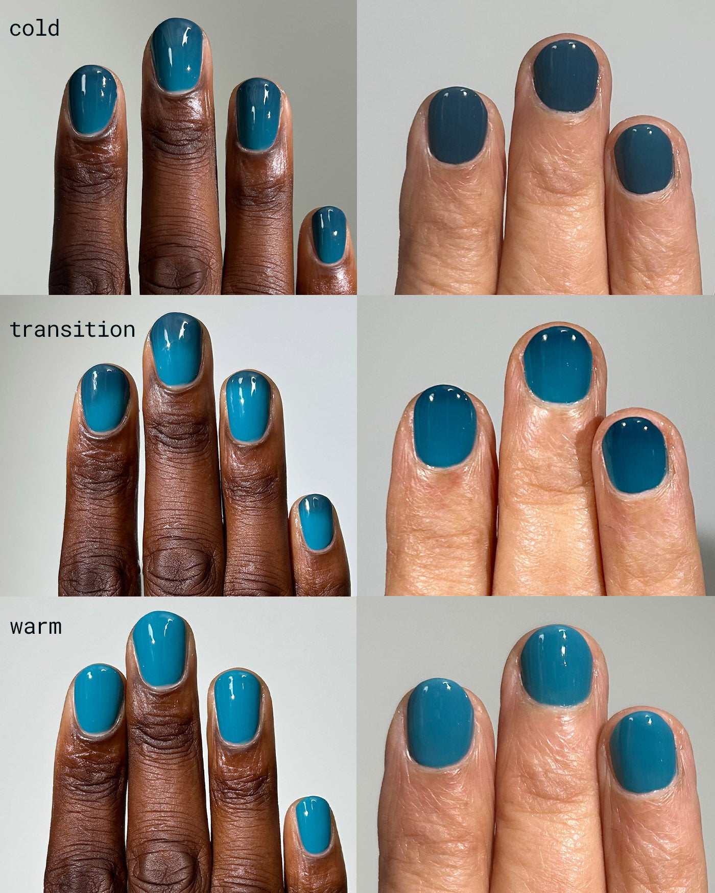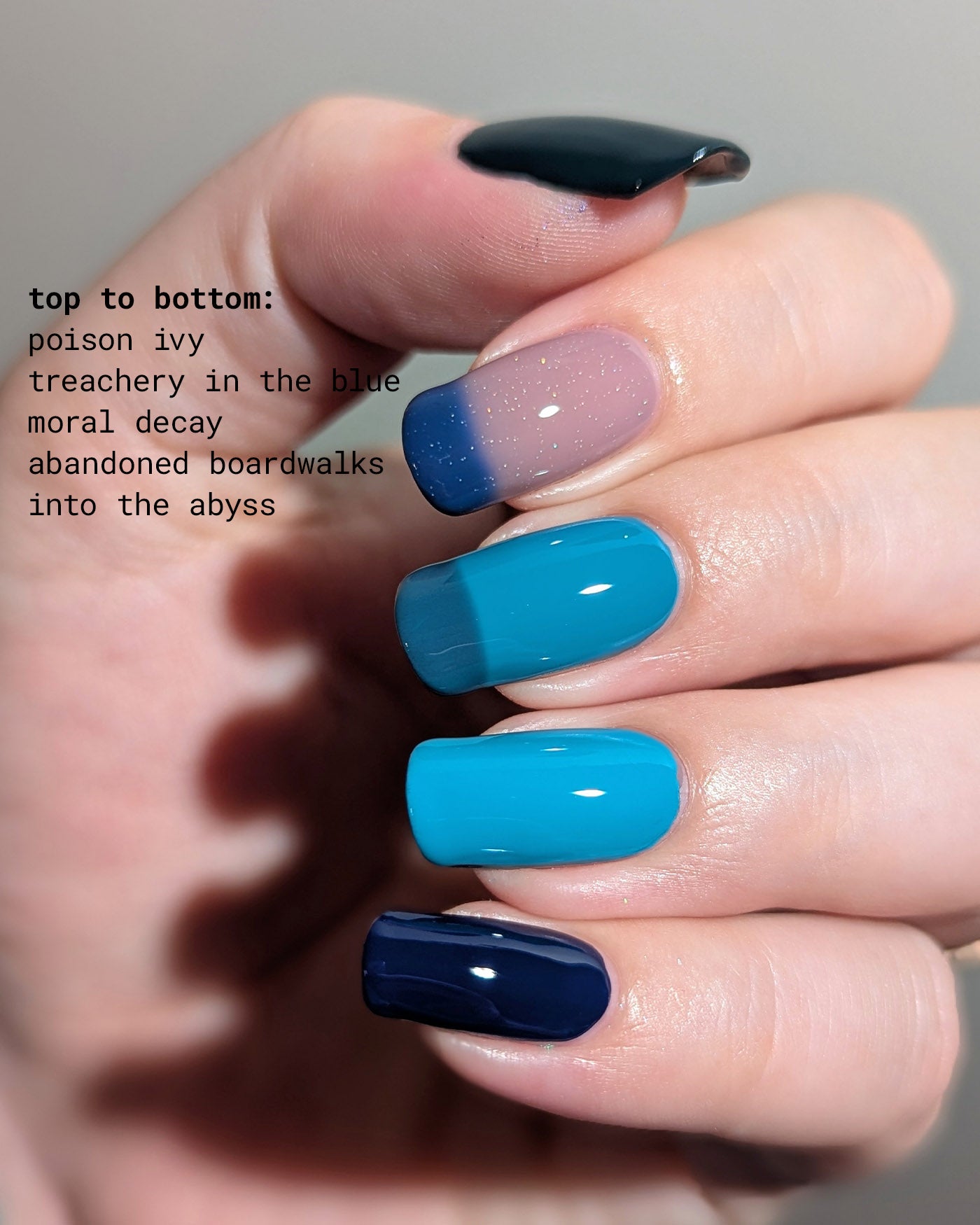 MORAL DECAY is a dark green to teal thermal lacquer that transitions from a shade of dark green-black when cold to bright teal when warm. from the WELCOME TO PARADISE SET.