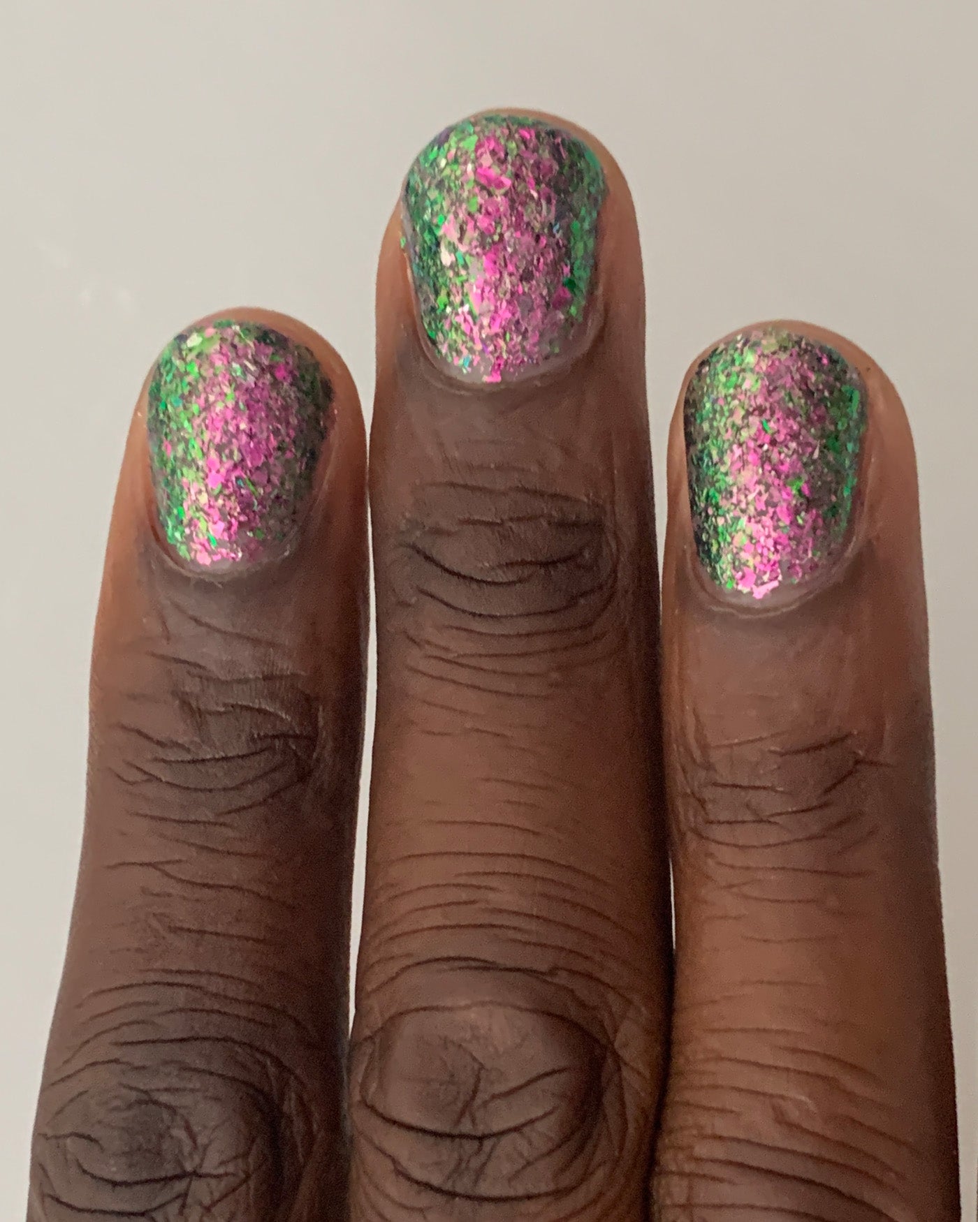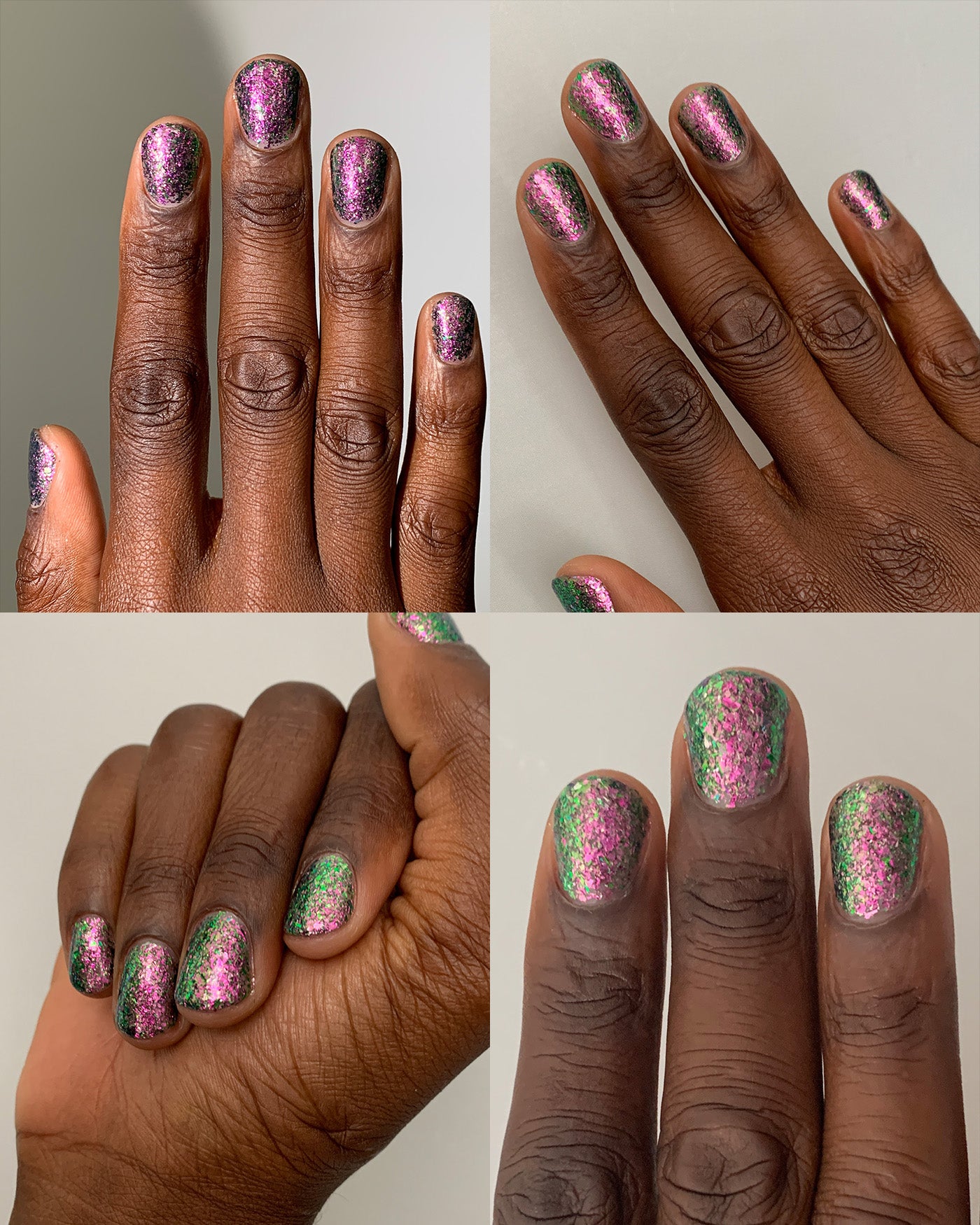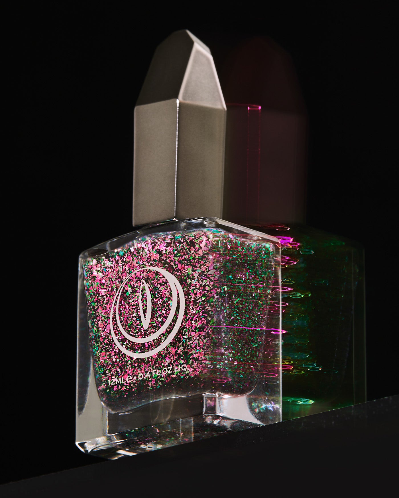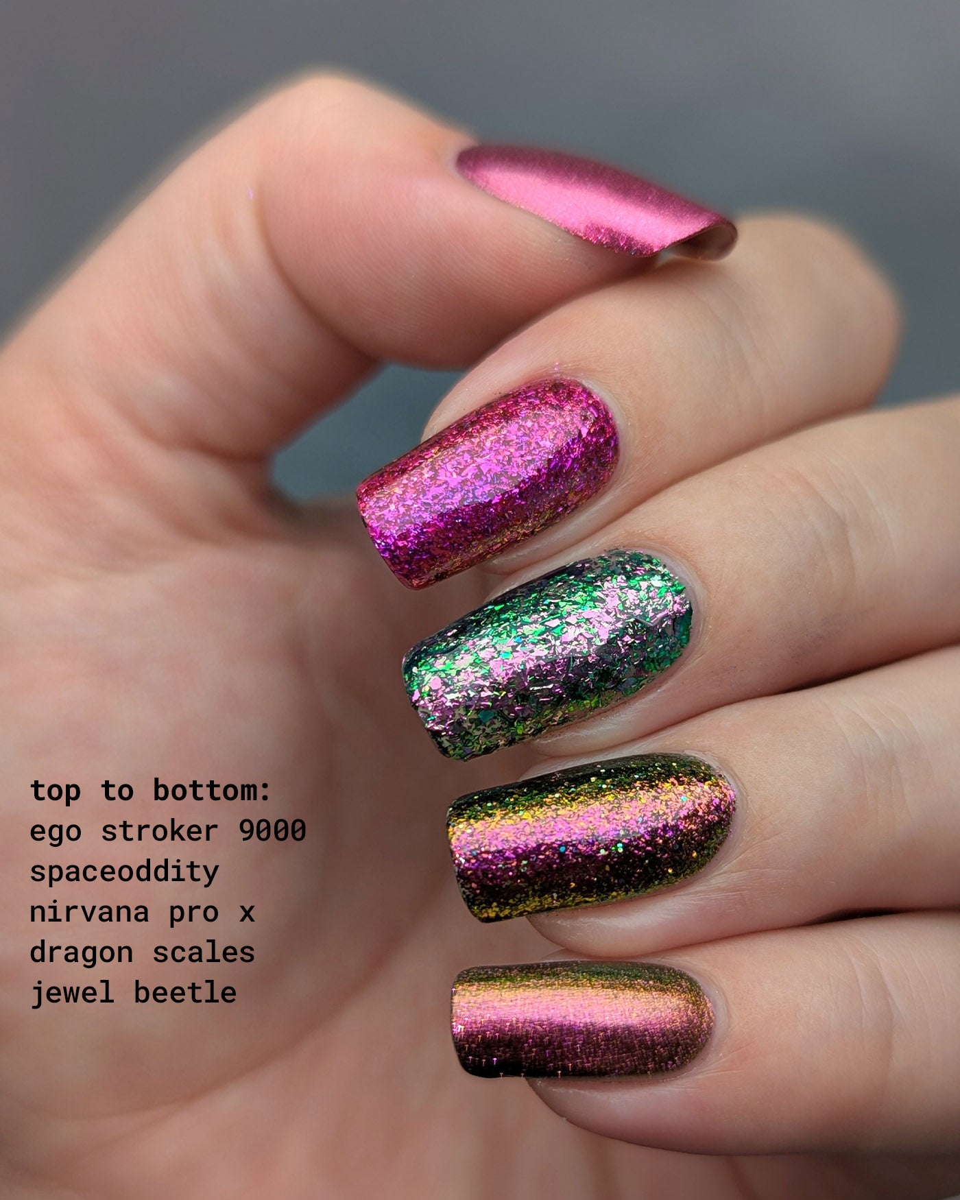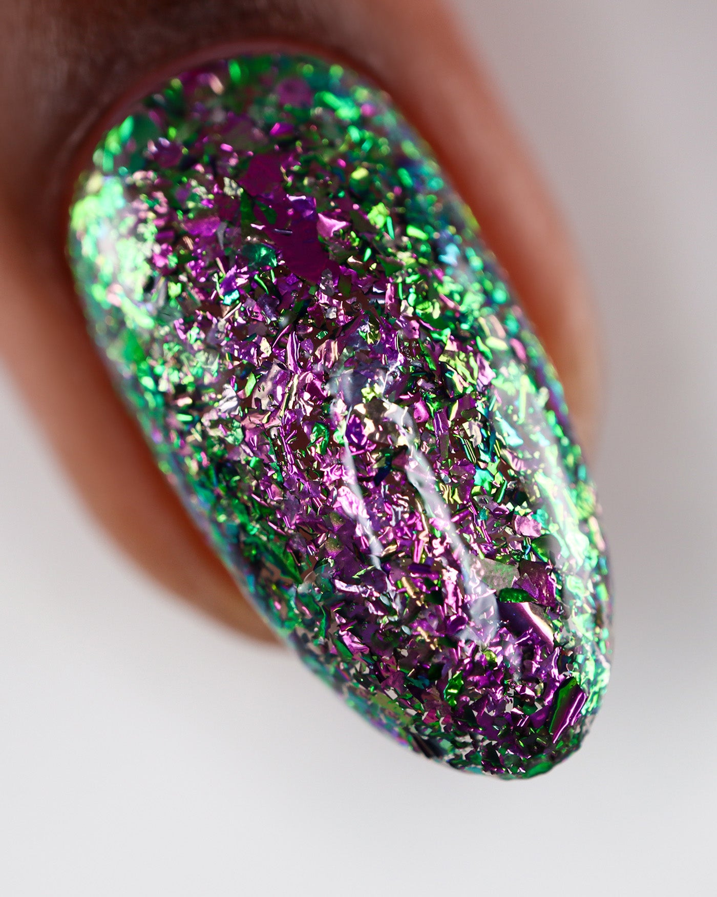 NIRVANA PRO X is a multichrome flakie lacquer packed with color-shifting silver to pink to green flakies. from the WELCOME TO PARADISE SET.