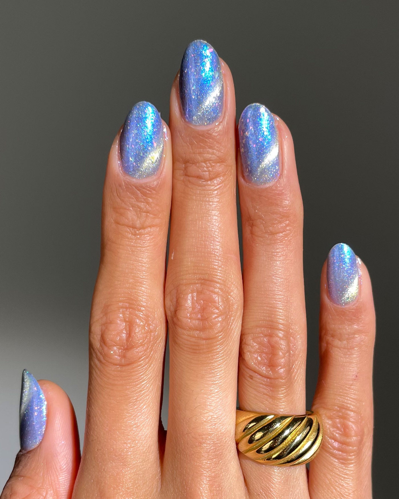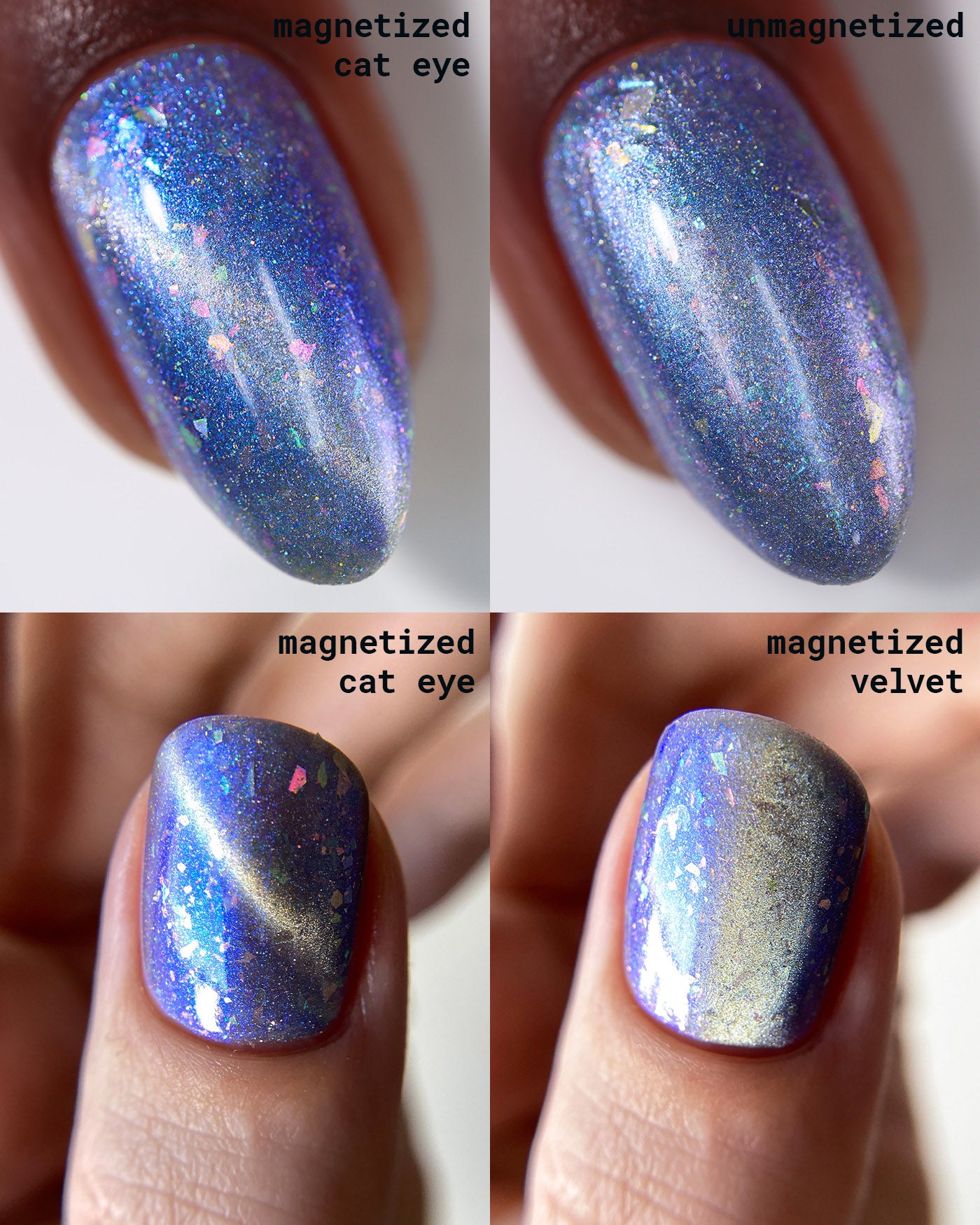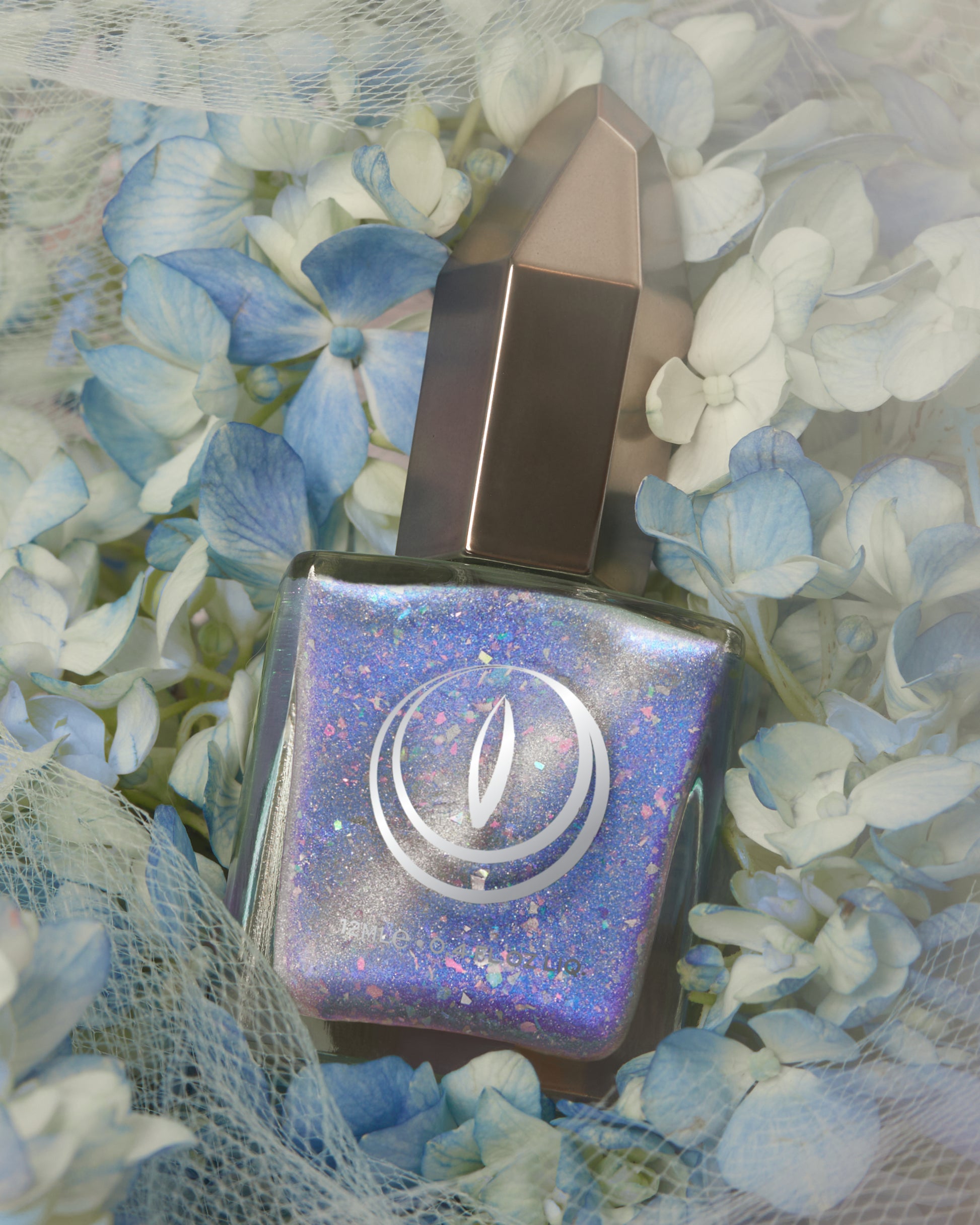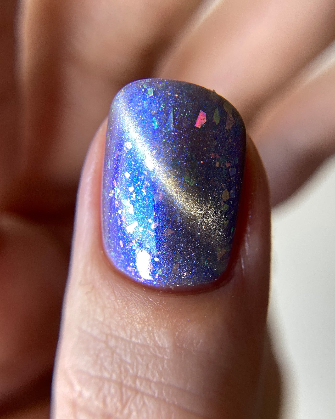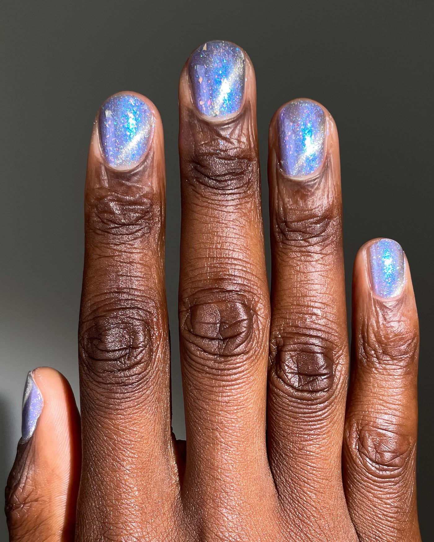 LA PETITE MORT is a light blue magnetic lacquer filled with holo shimmer, iridescent flakies, and holo glitter that reveals a silver magnetic stripe. from the BAROQUEN SET.