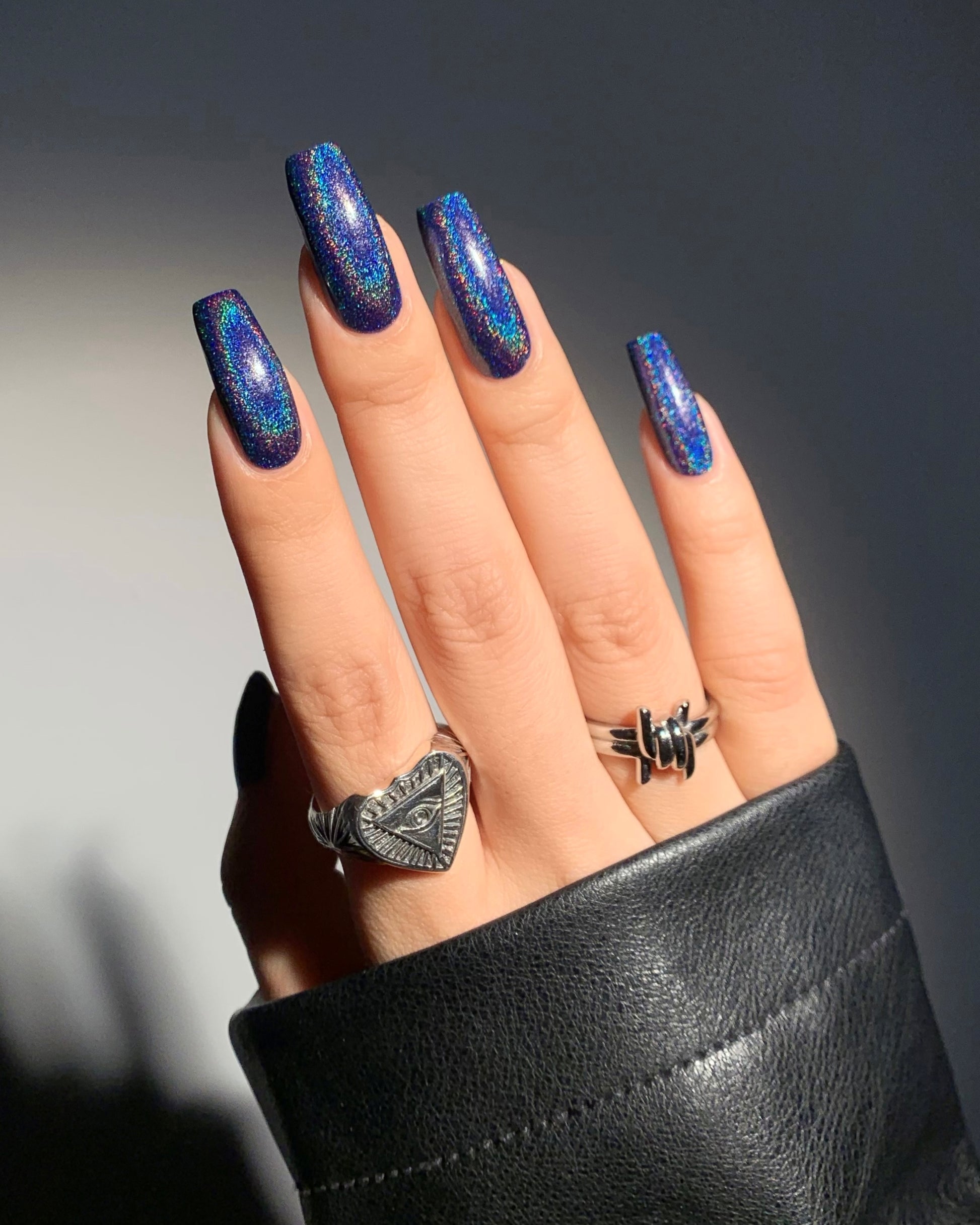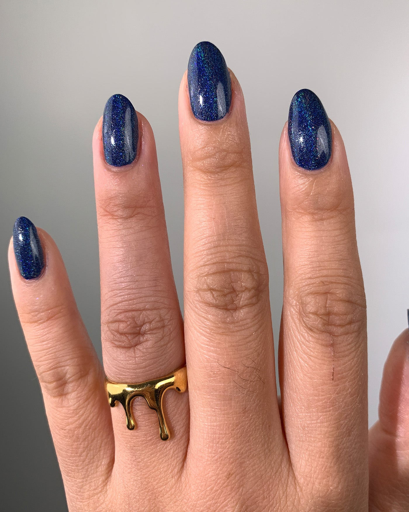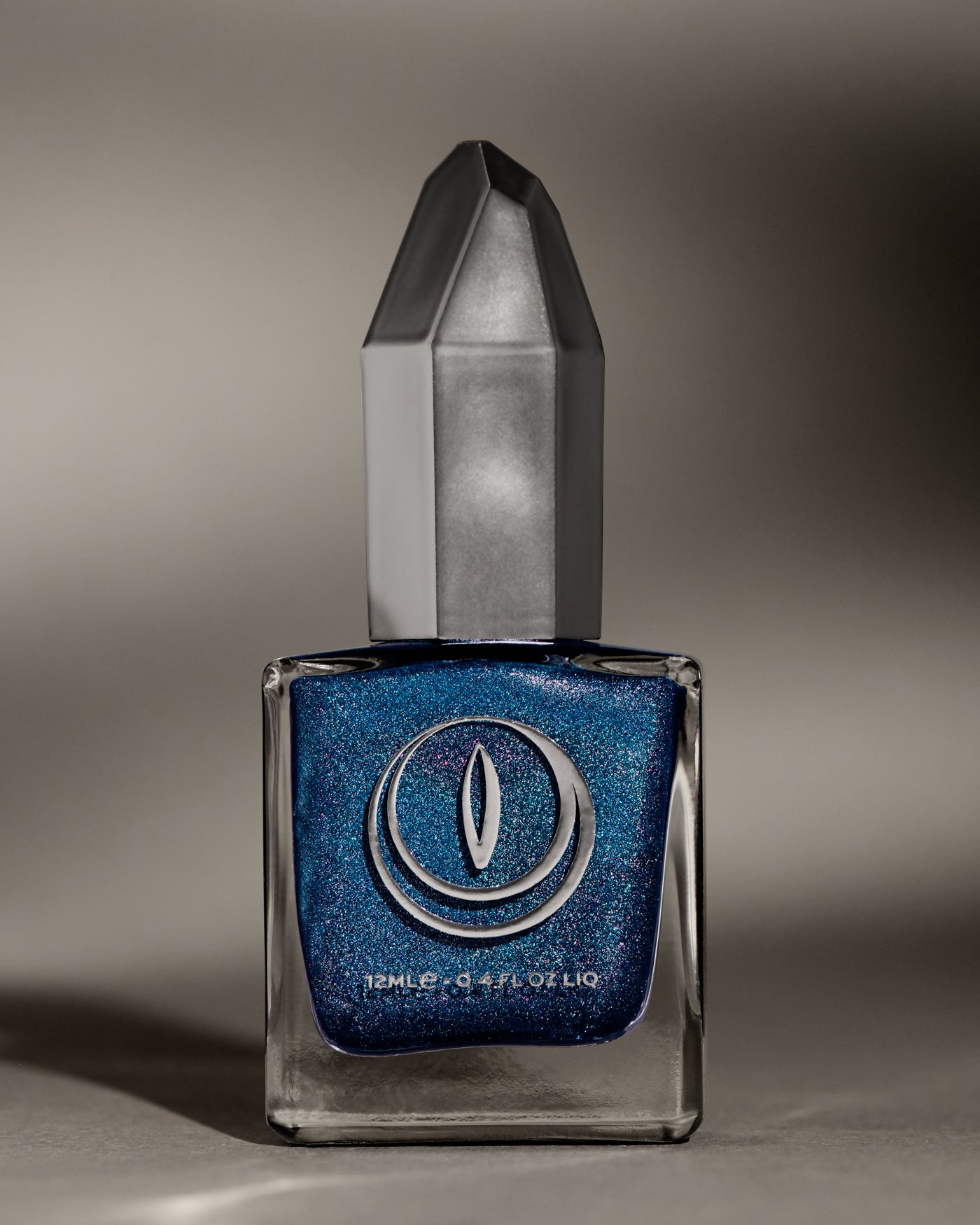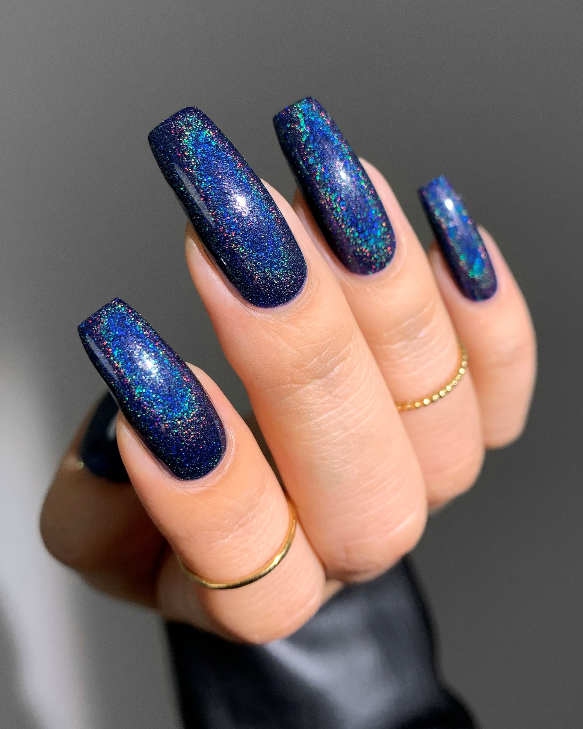 this holographic lacquer transforms in front of your eyes, as the electric navy blue base morphs to reveal the entirety of the rainbow spectrum. see it for yourself to believe it.