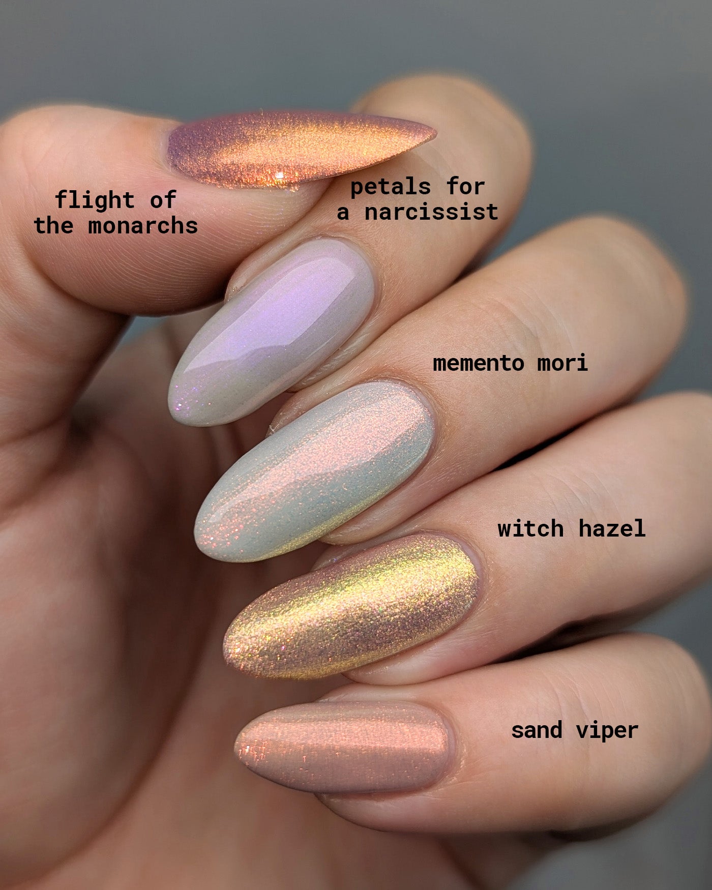 MEMENTO MORI is an ivory lacquer filled with orange shimmer. from the FALLEN SET.