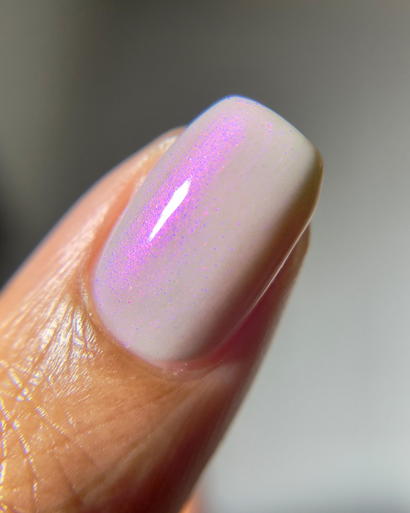 PETALS FOR A NARCISSIST is a sheer white-gray lacquer filled with violet pink shimmer. from the SEASONS OF PERSEPHONE SET.