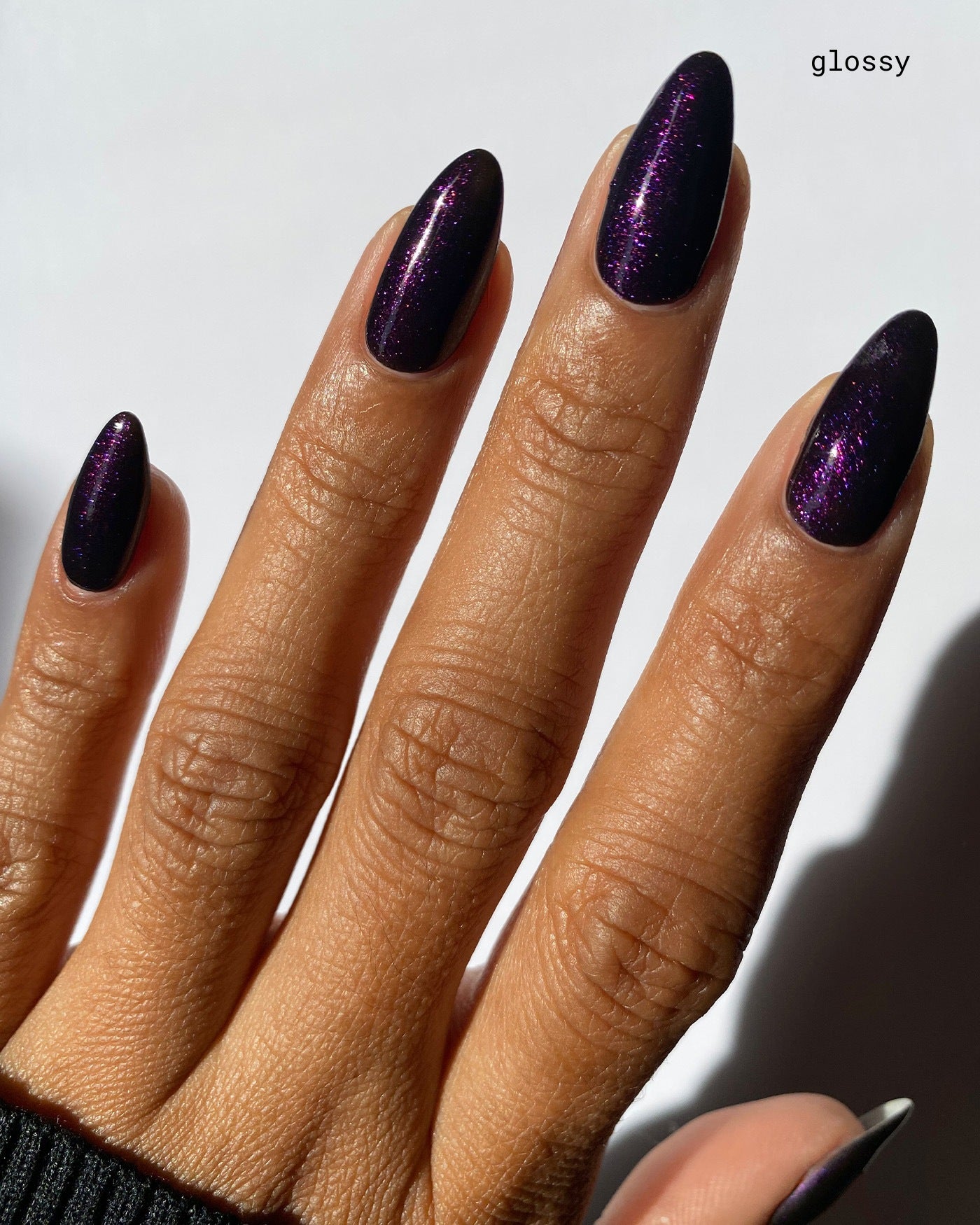 the faint promise of the impending ‘nevermore.’ a dark omen looms on the horizon in this ominous black matte lacquer. as subtle glints of purple and pink shimmer whisper of what’s always fleeting.