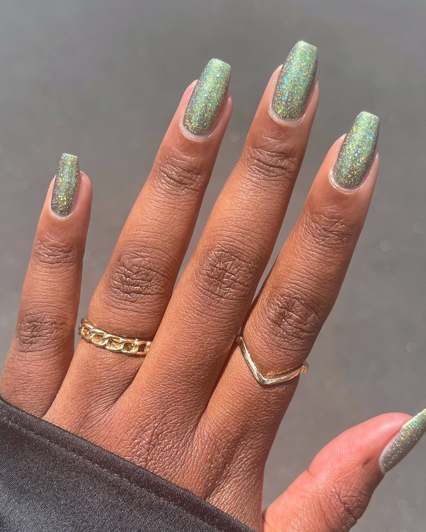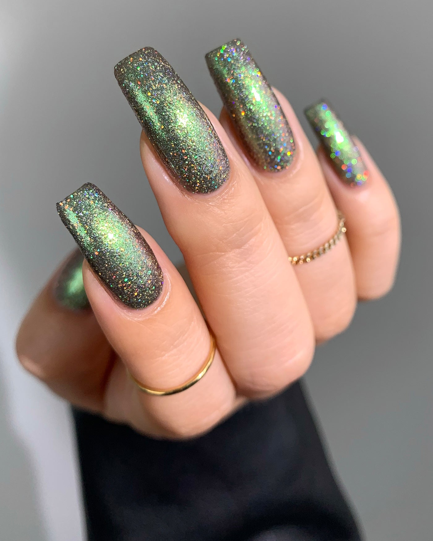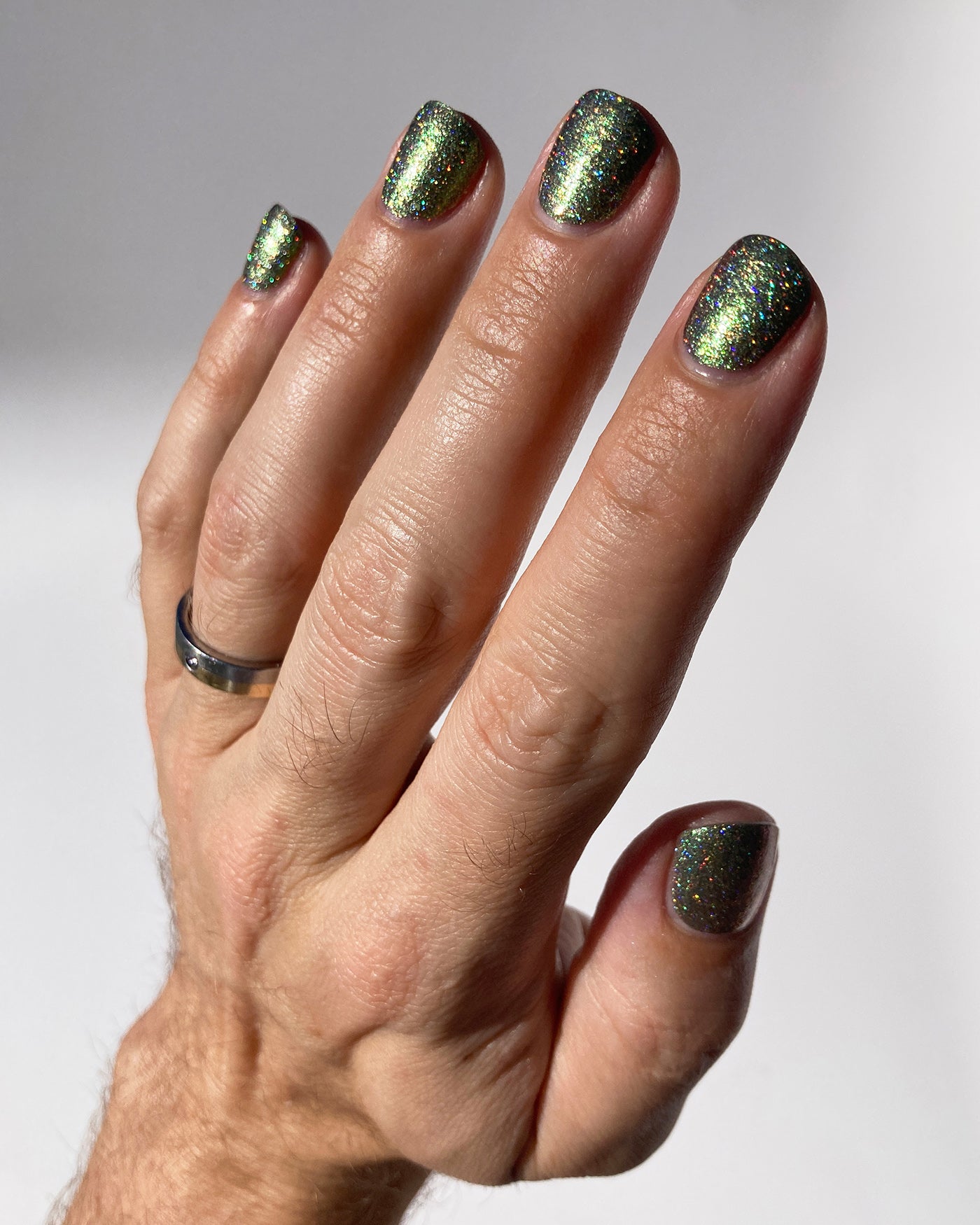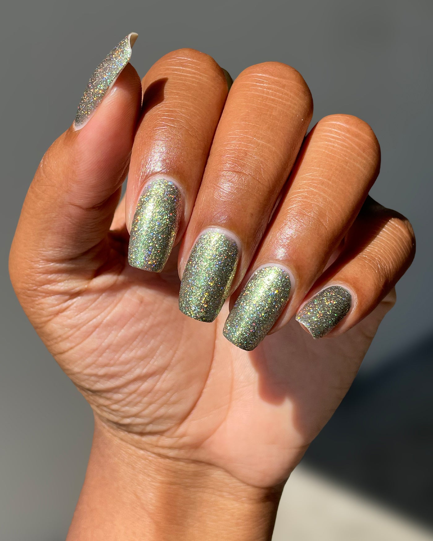 make mother medusa proud. unbottle your festering fury and dip your claws into something suitably serpentine. as this sinister shade slithers from green-to-gray and crackles with golden glints of your most holographic inner fire, it’ll have all of your nail nemeses recoiling with near immediate regret.