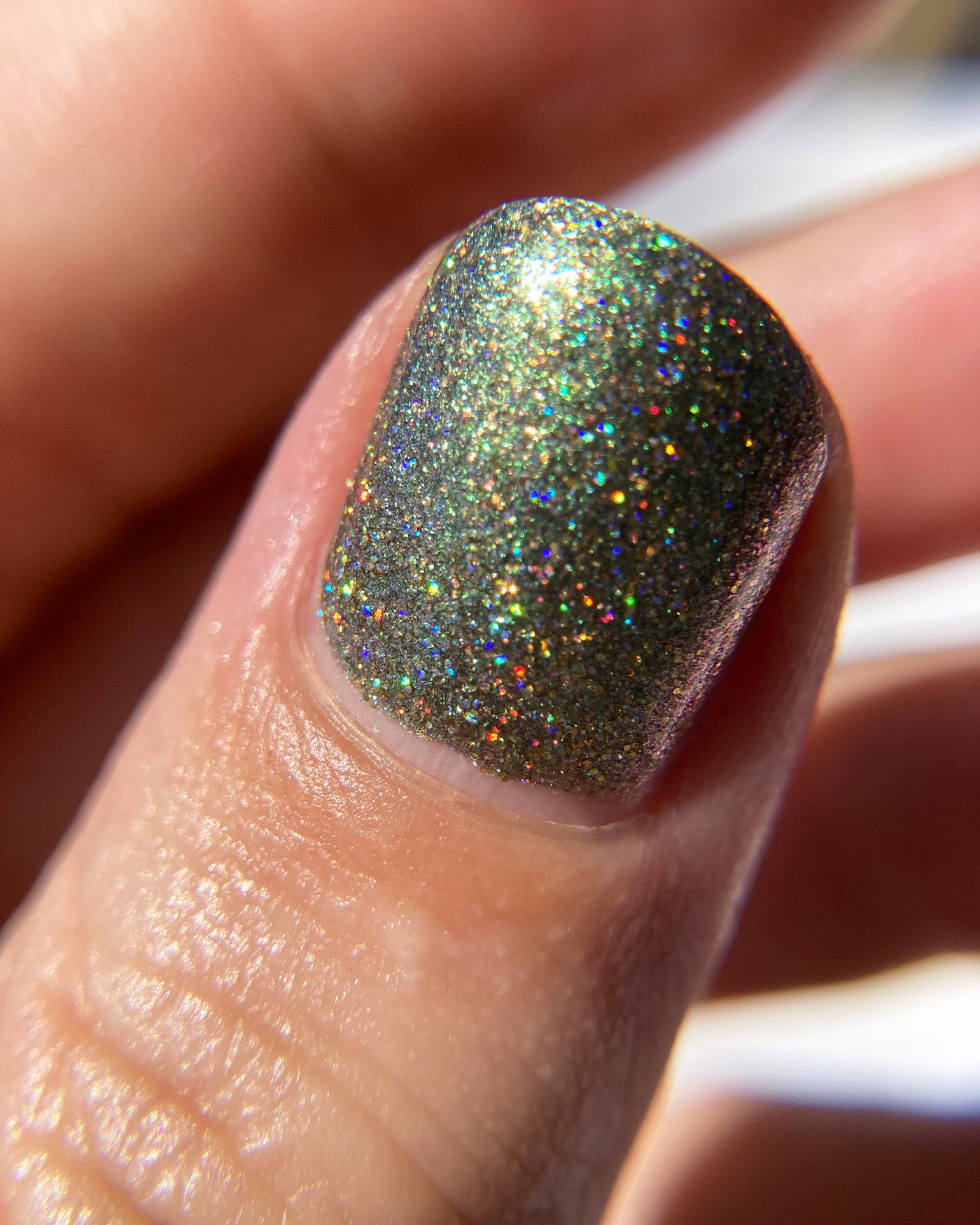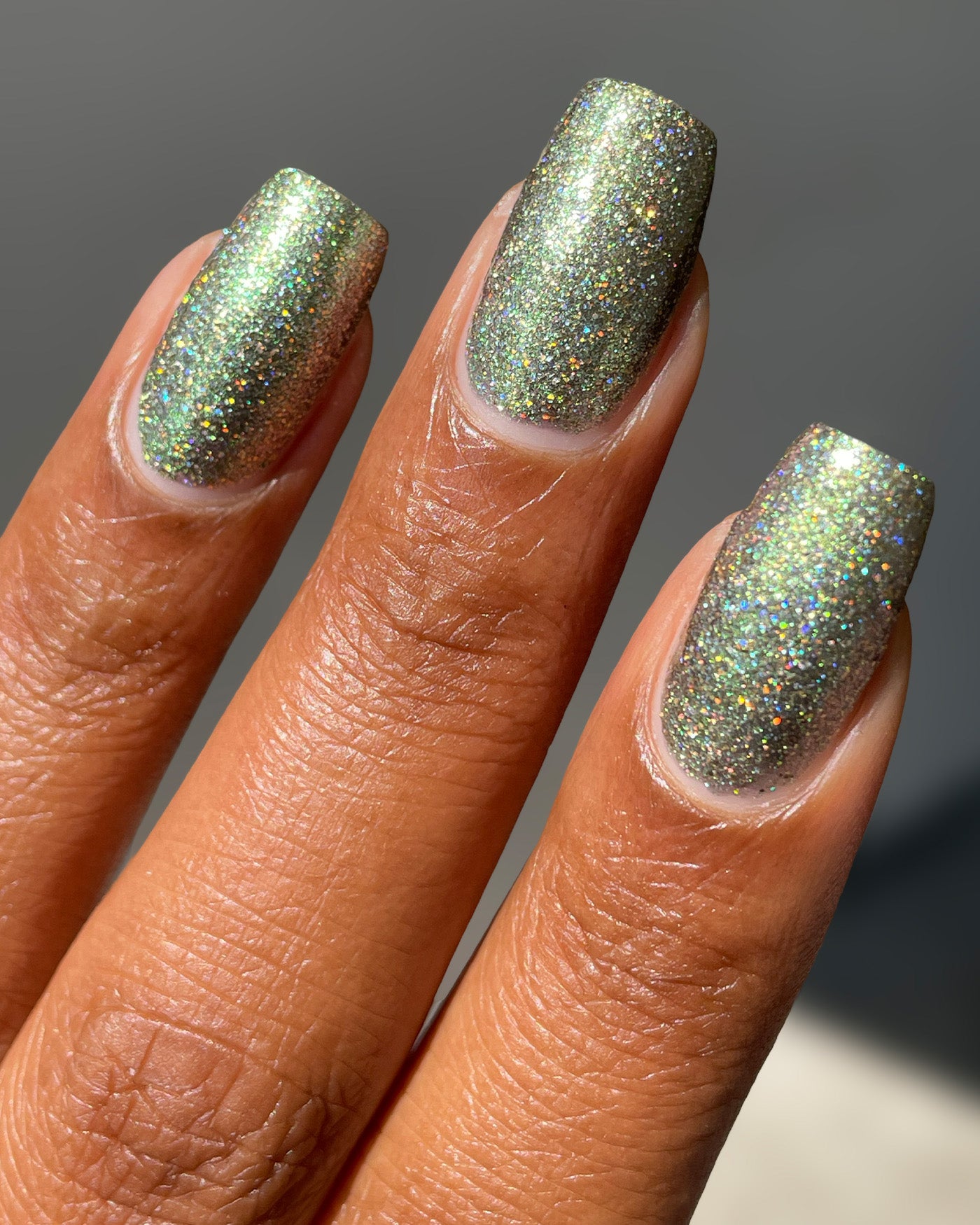 SPAWN OF MEDUSA is a duochrome lacquer filled with holographic glitter that shifts between shades of green and gray. from the MEDUSA UNLEASHED SET.