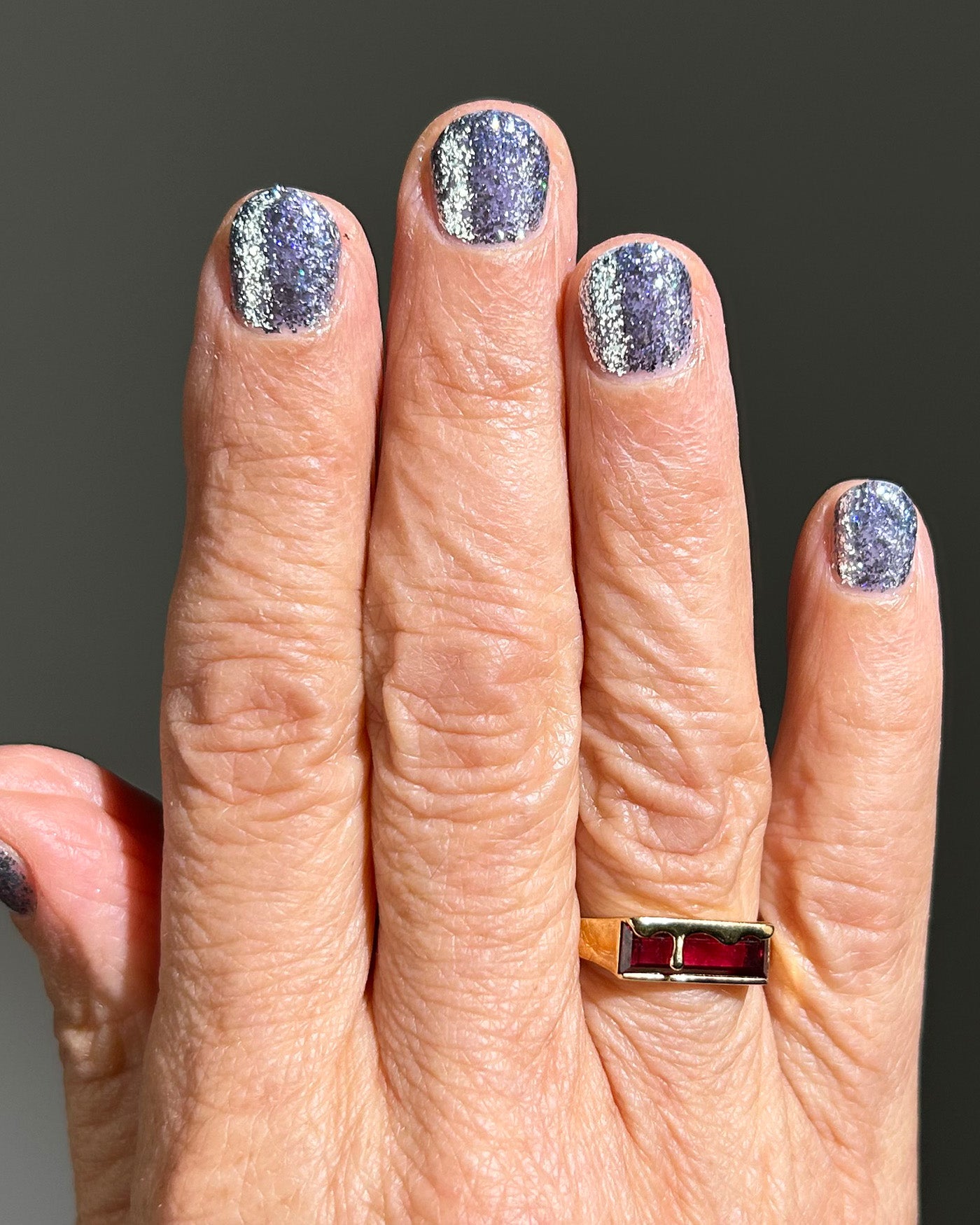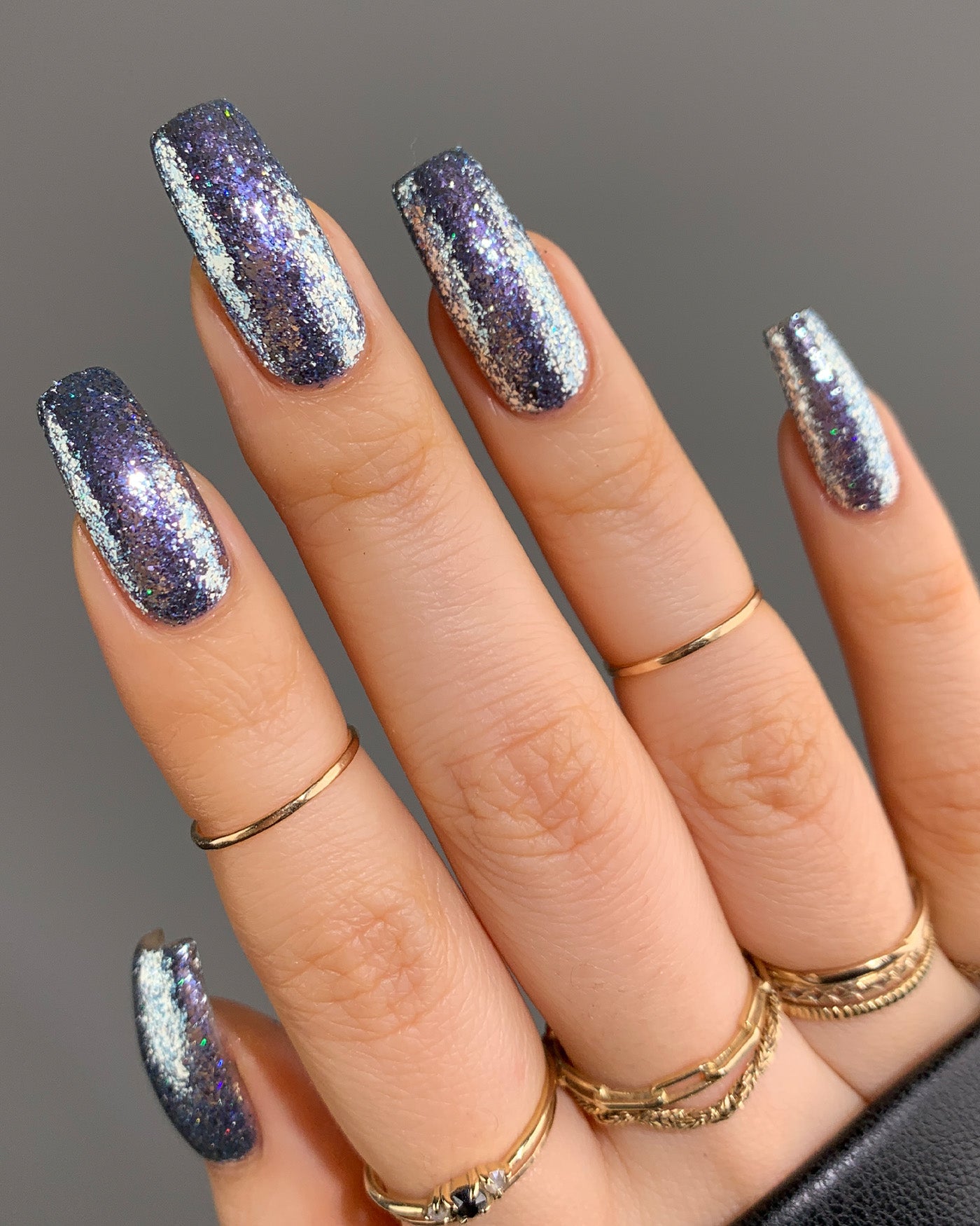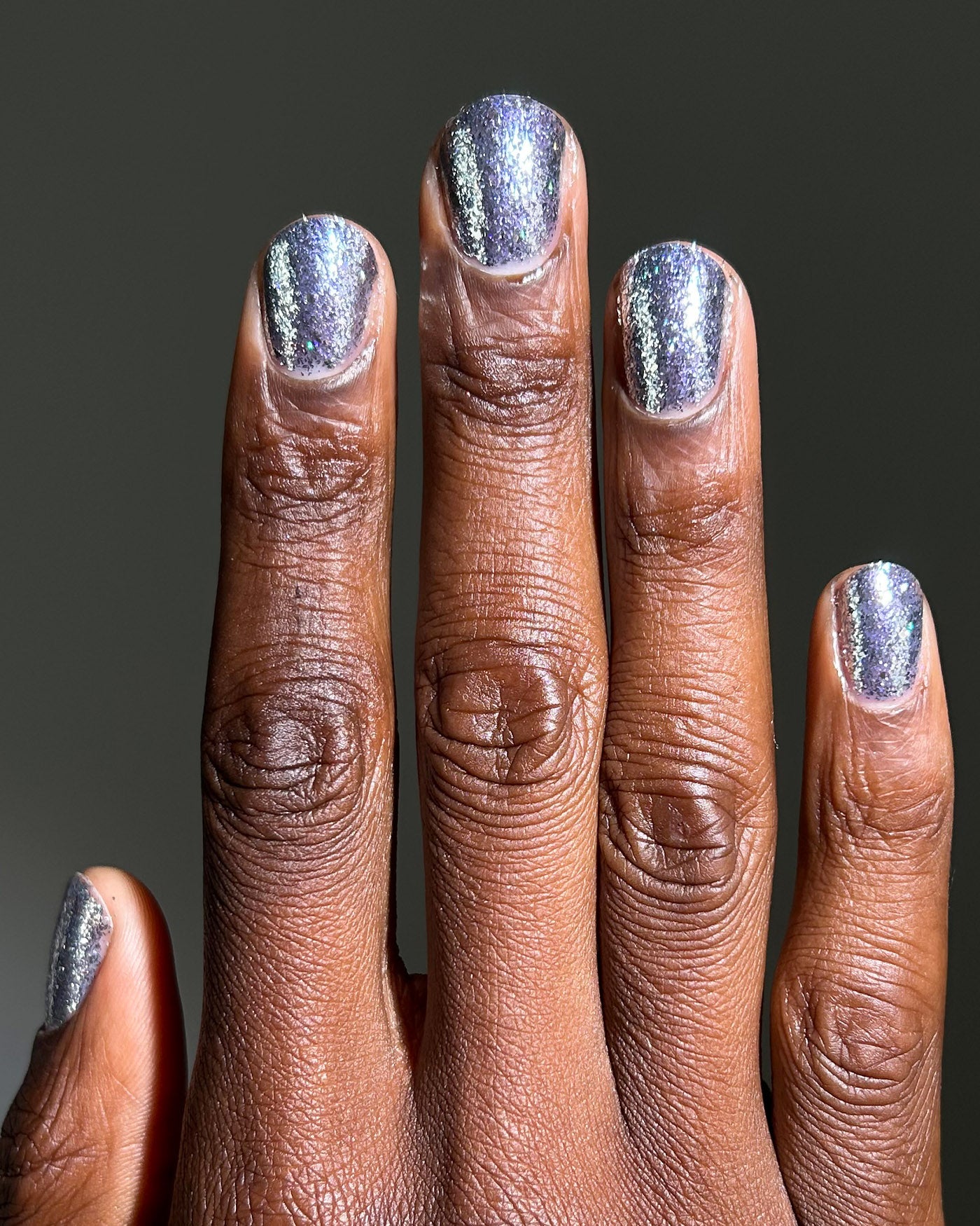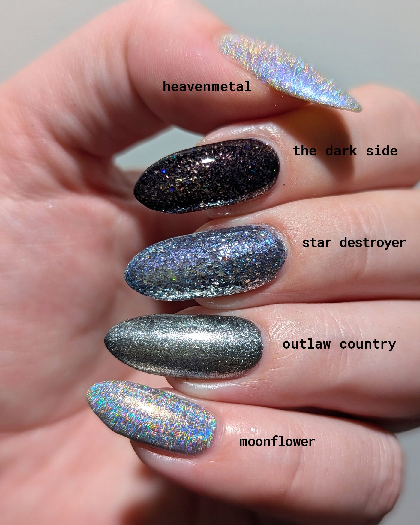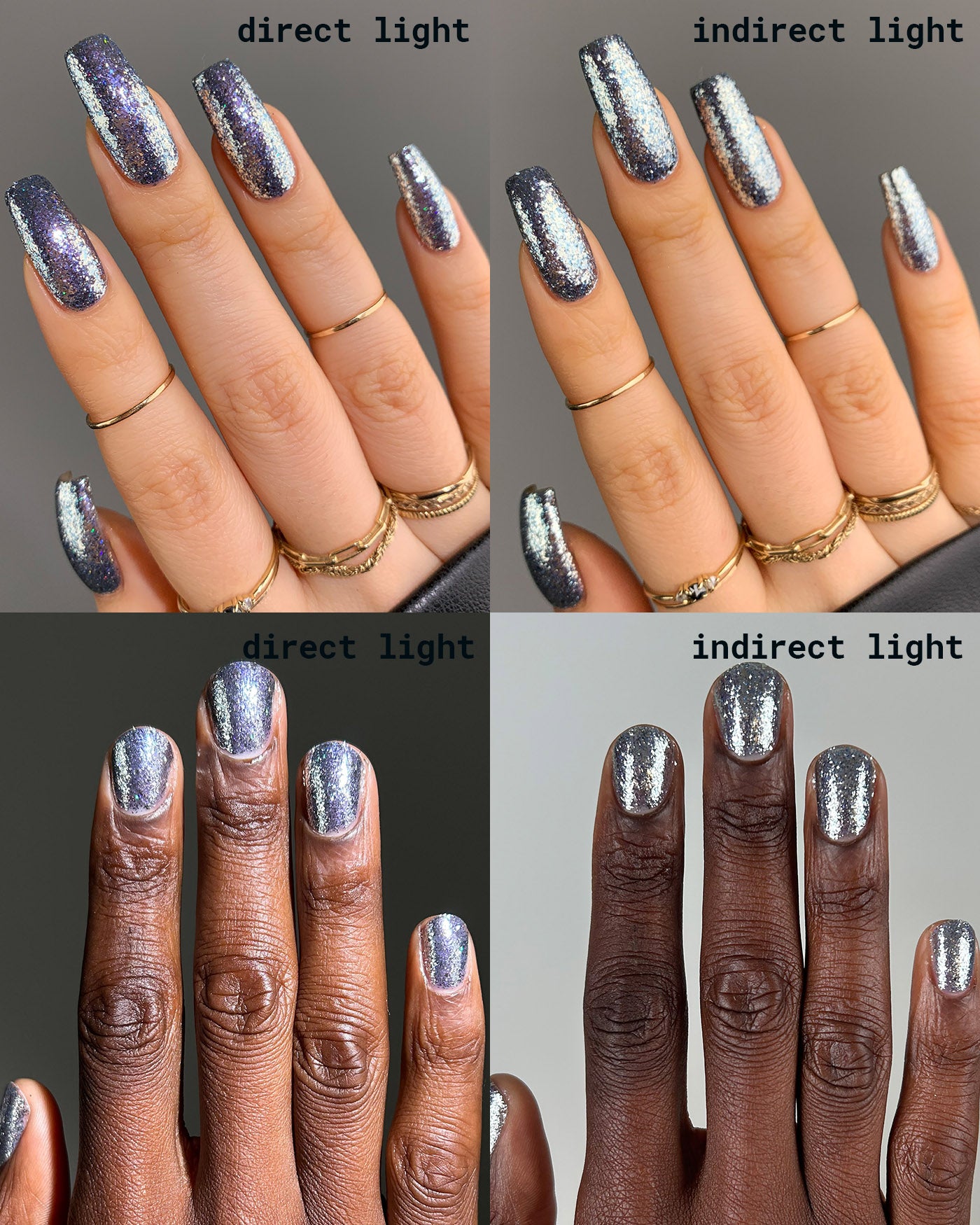 your dagger-shaped claws deserve to travel in the most marvelously menacing style. armored in seemingly hundreds of panels of silver metallic flakies and dotted with the glittering, holographic glint of turbolasers and beam projectors, it's no wonder this lacquer is a fearsome symbol across the galaxy. currently suspended in a frosty blue backdrop, it seems we may soon be descending upon an icy, HOTH-like sky…