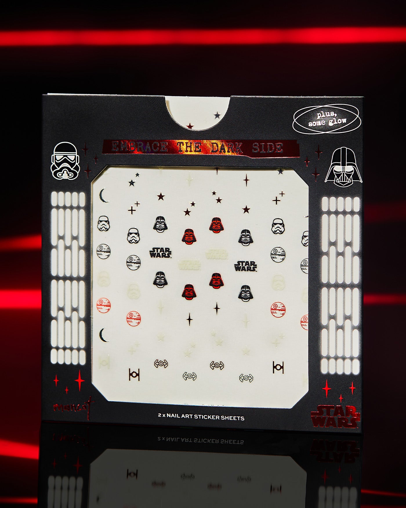 our pack of STAR WARS™ JOIN THE DARK SIDE NAIL ART STICKERS includes 2 sticker sheets with an assortment of dark side inspired designs - some of which glow-in-the-dark. from the JOIN THE DARK SIDE SET, conjured in collaboration with STAR WARS™ - and only available while limited supplies last.