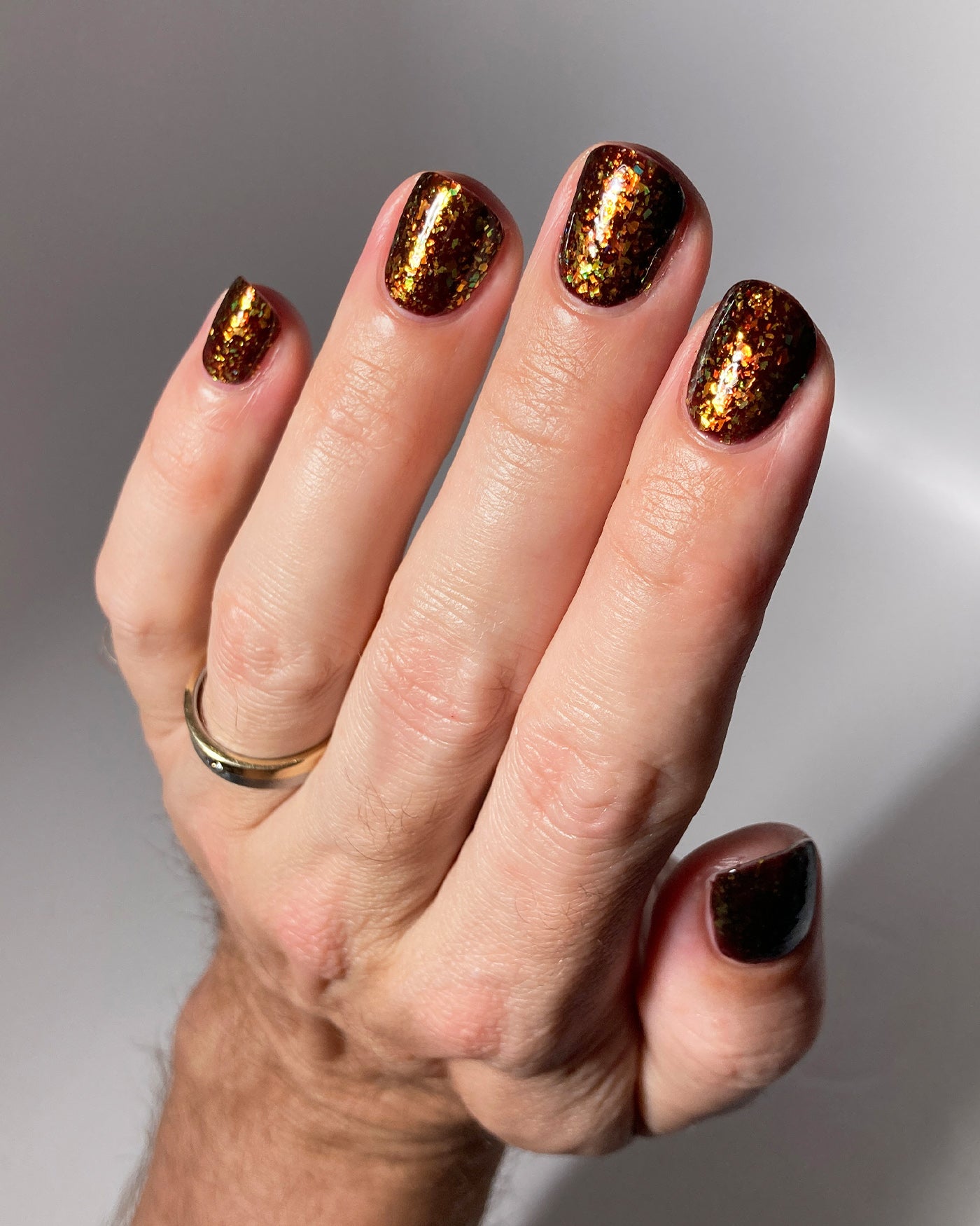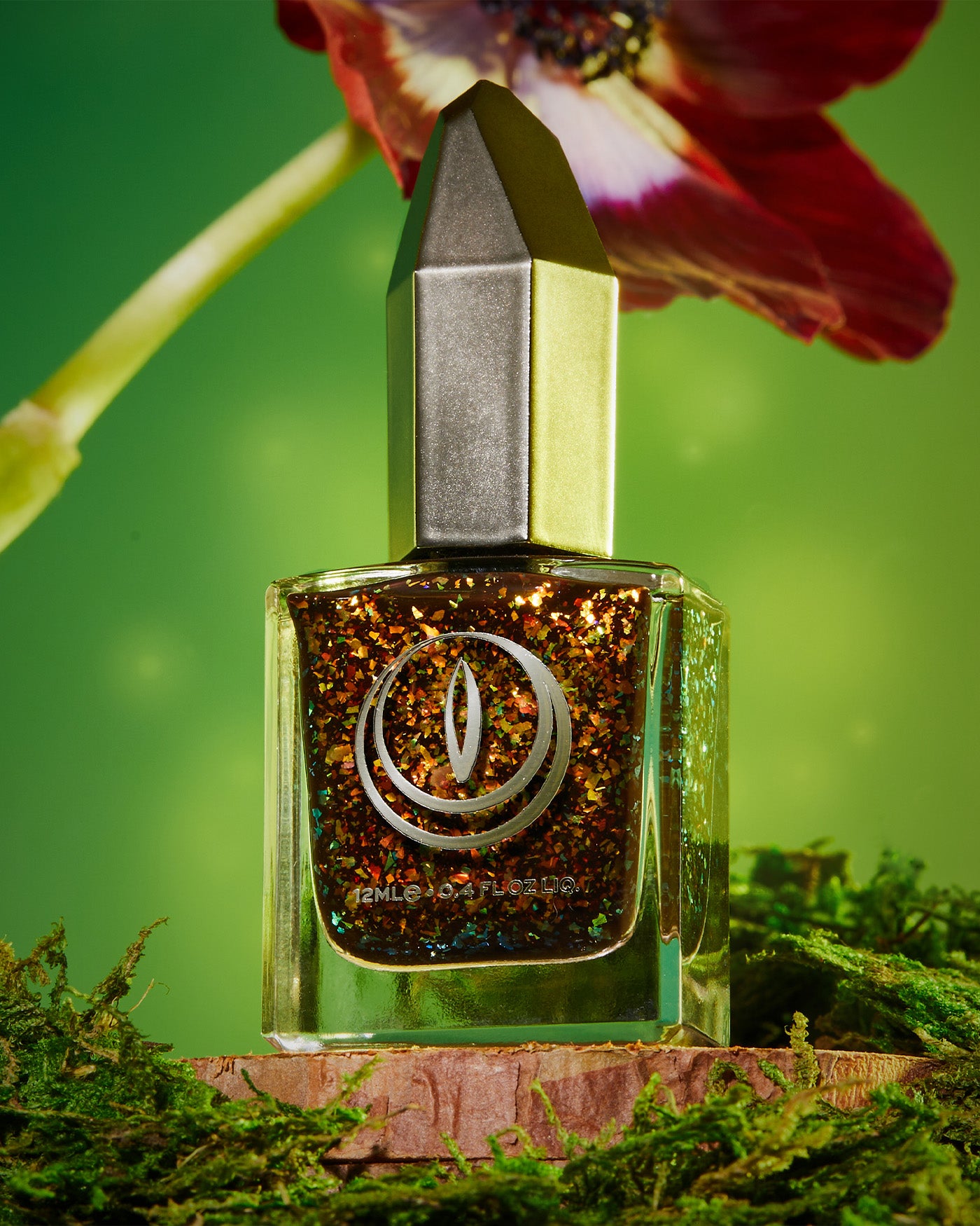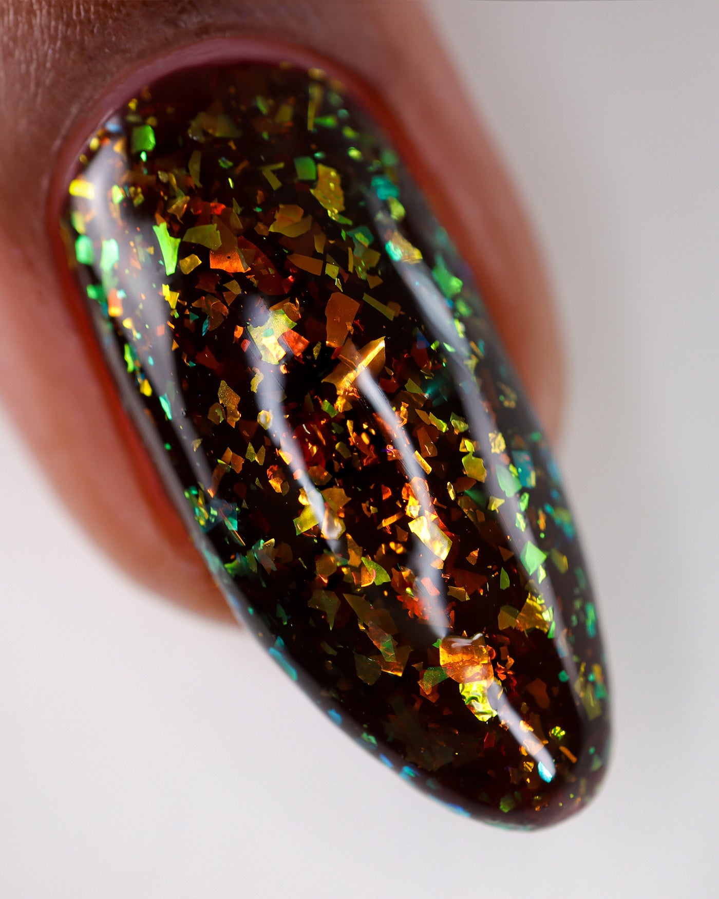 when you inevitably can’t decide what shade to wear, know that you can truly never go wrong with this v enchanted neutral. it’s a real chip off the old block - a rich, bark-like dark brown filled with a cascading rush of leaf-like flakies that color-shift between summery greens and warm autumnal hues even faster than the seemingly ever-changing seasons.