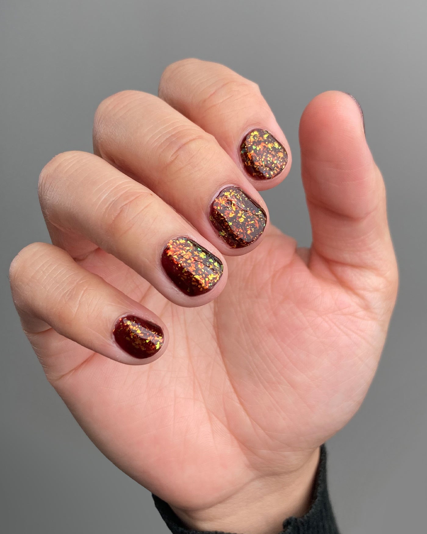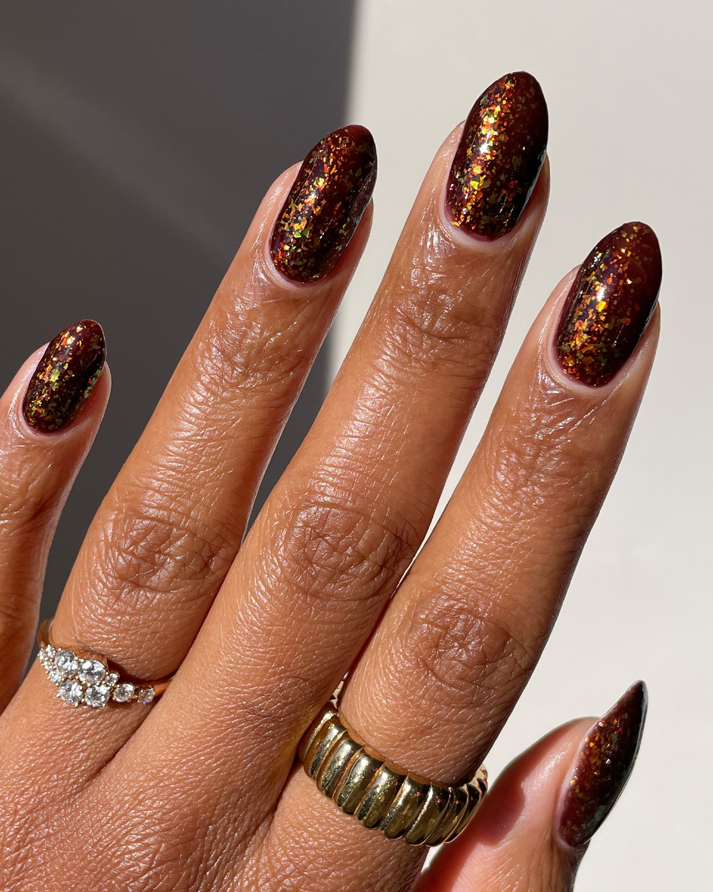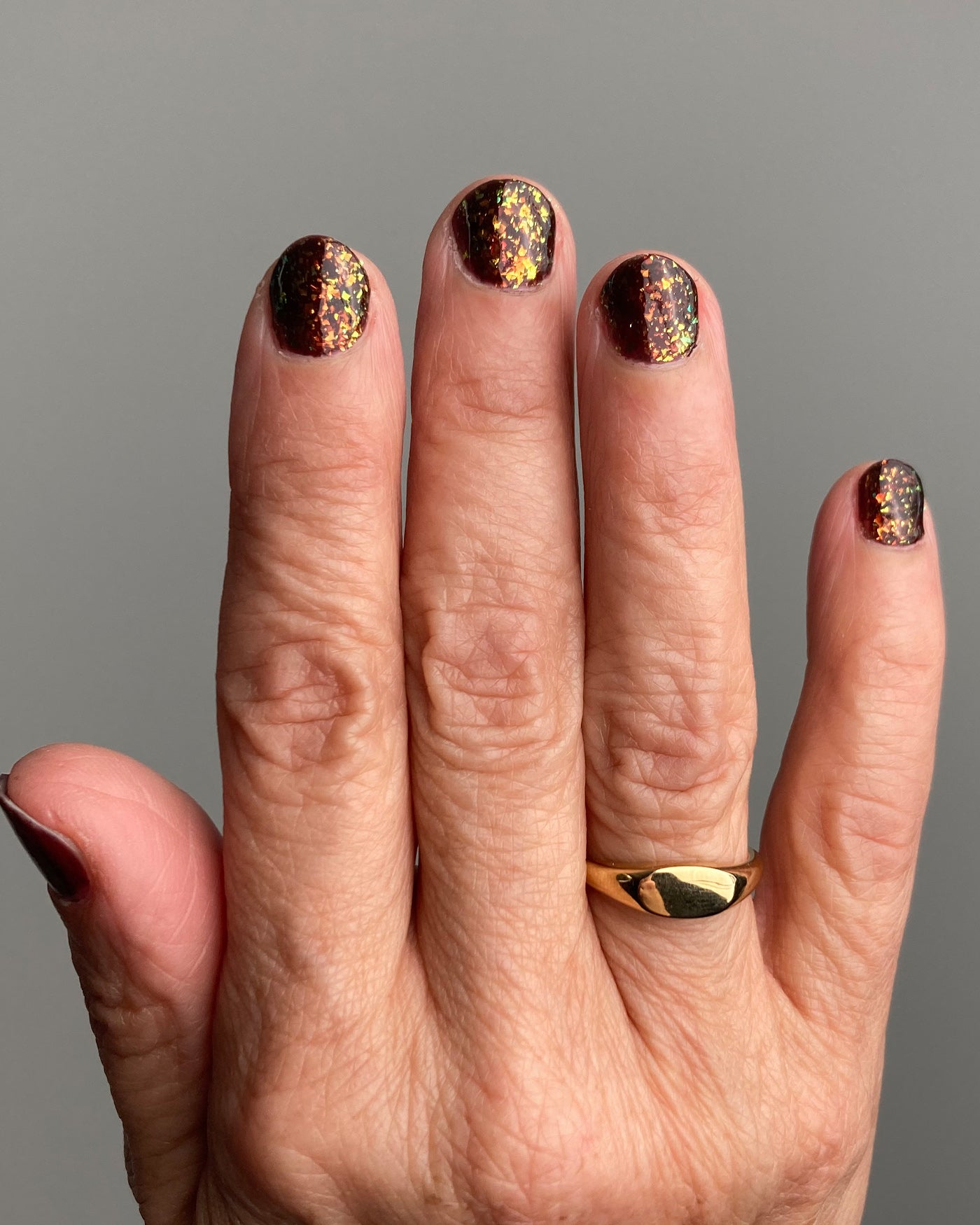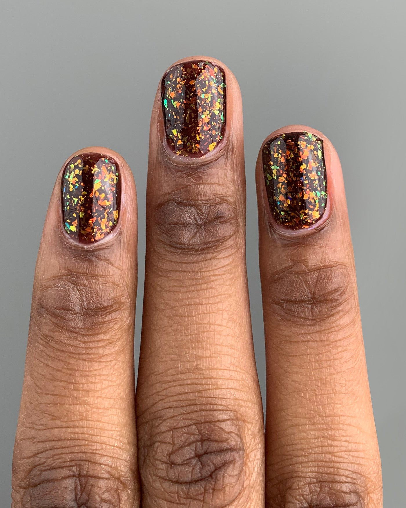 when you inevitably can’t decide what shade to wear, know that you can truly never go wrong with this v enchanted neutral. it’s a real chip off the old block - a rich, bark-like dark brown filled with a cascading rush of leaf-like flakies that color-shift between summery greens and warm autumnal hues even faster than the seemingly ever-changing seasons.