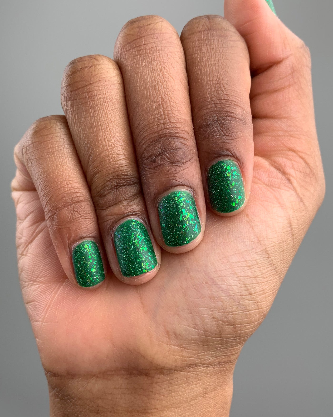sink your tiny claws into this metaphorically MASSIVE matte shade and you’ll paint your clawversaries green w envy. bc this ferocious phenom packs a truly powerful bite - w a seemingly never-ending cascade of scale-like green multichrome flakies and an alluring ambush of reflective glitter. it would turn even the most casual nailies clawnivorously ravenous.