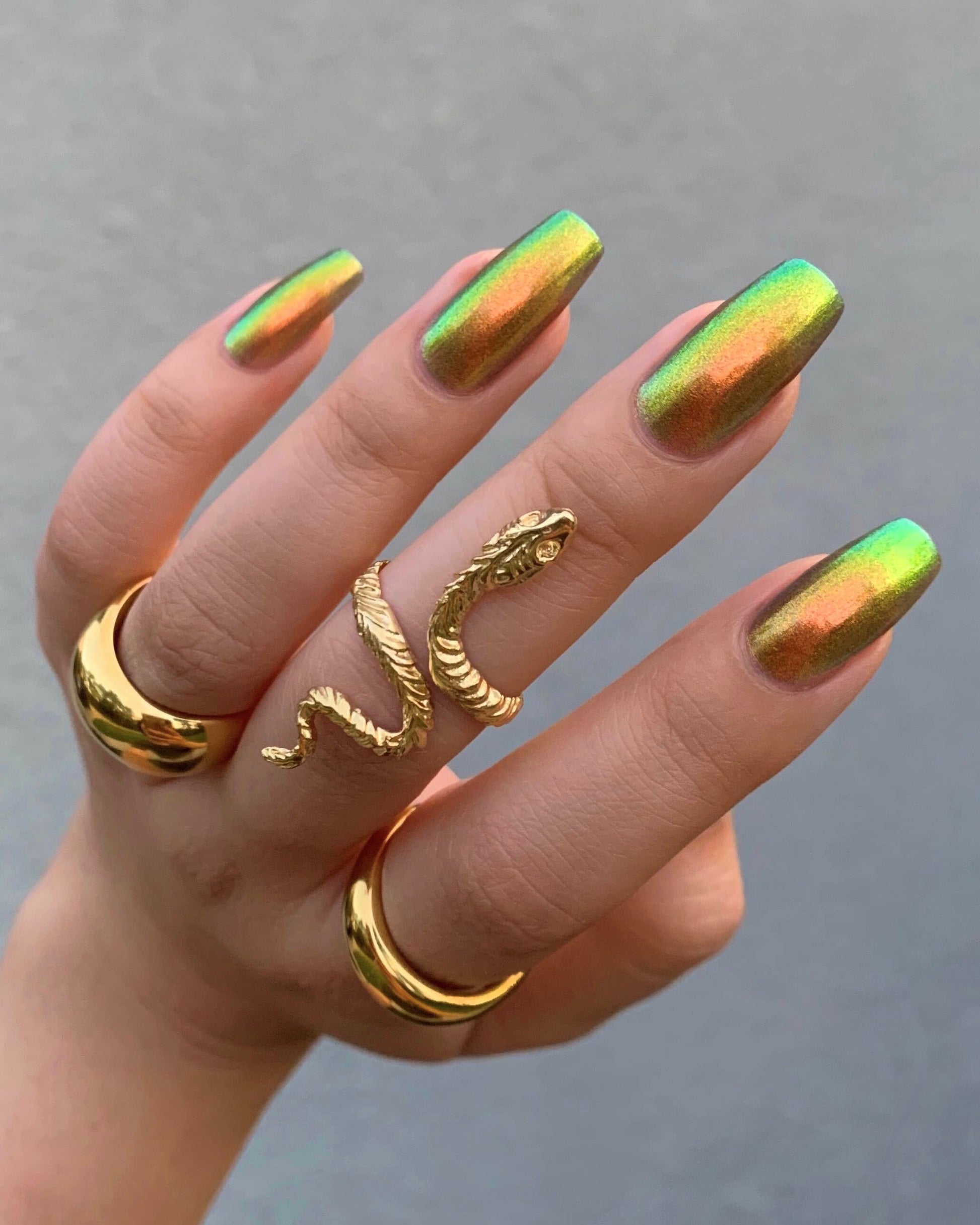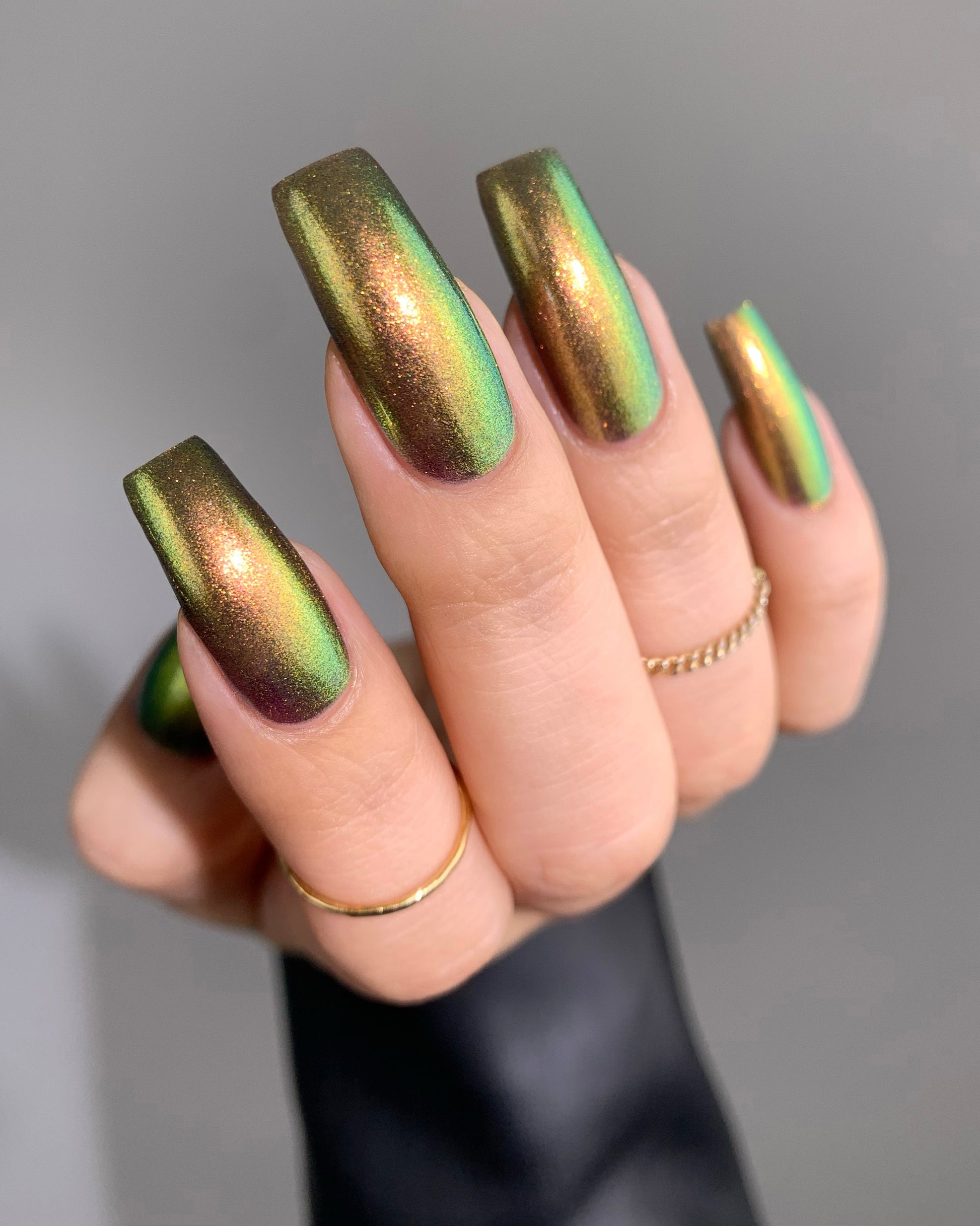VAPORIZE is a multichrome lacquer that shifts between shades of green, orange, and yellow as it’s viewed from different angles.